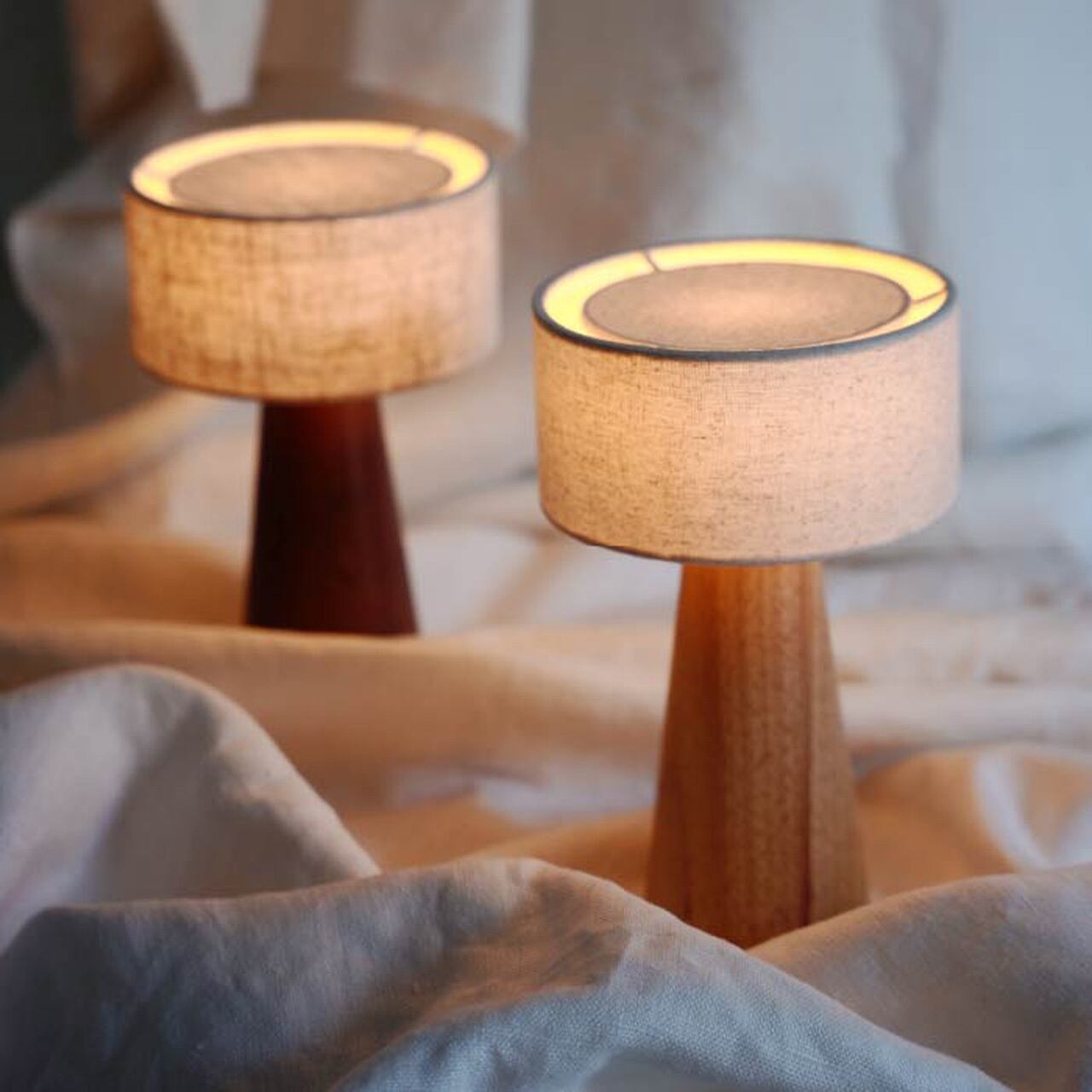 天然木とファブリックのやわらかな質感。リビング、寝室、書斎にも。あかりのある時間をもっと自由に楽しめる、素材感にこだわった充電式ポータブルランプです。天然木を削り出してつくられたフォルムは、素材そのものの温かみや重みを感じられる仕上がりです。余計な要素を排除し、自然素材の美しさを際立たせました。やさしく広がる光は、素材の質感があたたかいシェードを通し、まぶしさを抑えながらも心地よい明るさを確保。タッチセンサー式の電源ボタンは調光にも対応し、メモリー機能も備えています。付属のUSBケーブルで充電でき、使う場所を選ばずお使いいただけます。