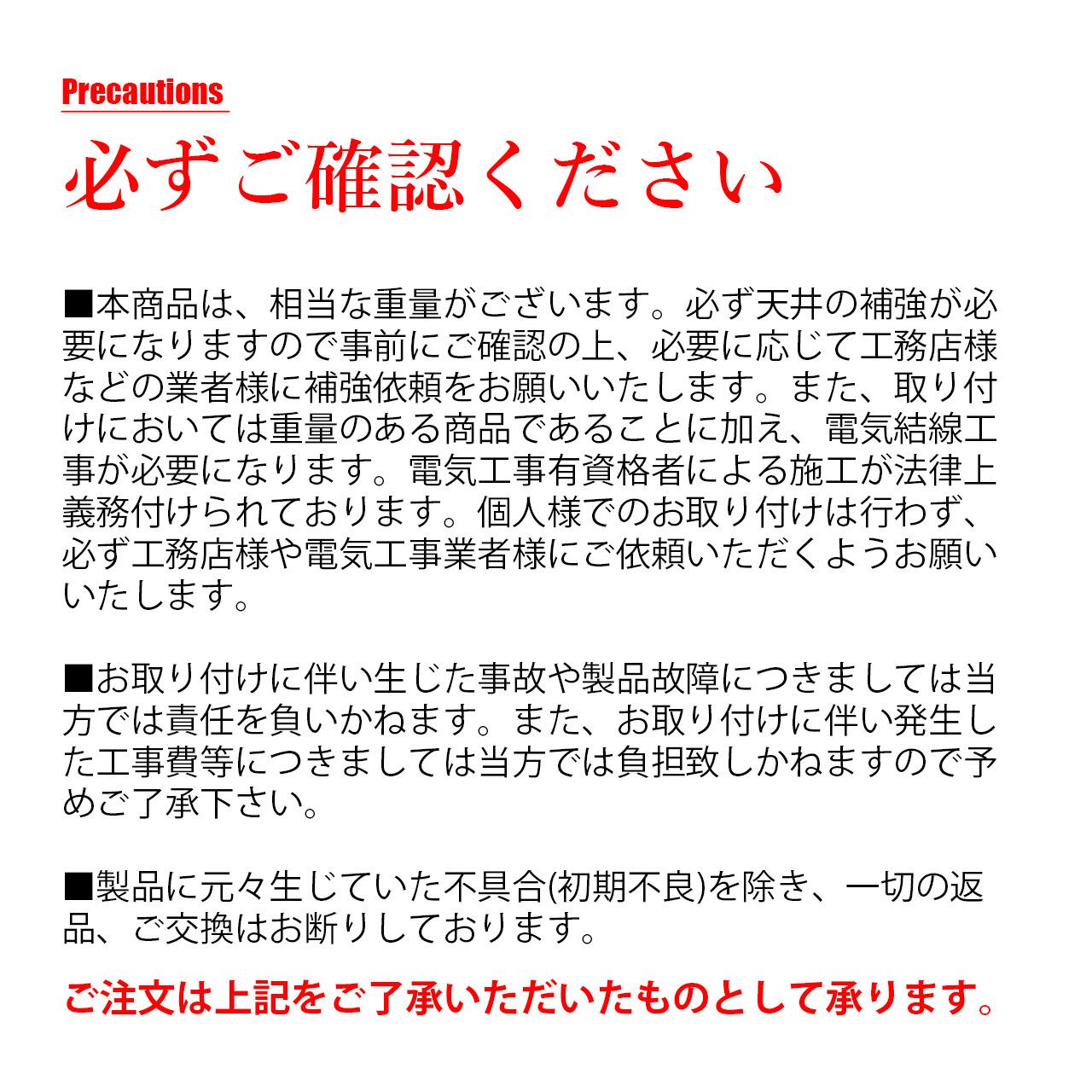 以上により、必ずお求め前に電気工事業者様や工務店様などにご相談いただきました上、お取り付けは必ず業者様にご依頼ください。本品のお取り付けに関わる費用や事故等につきましては一切の責任を負いかねますので、ご了承の上お求めください。
