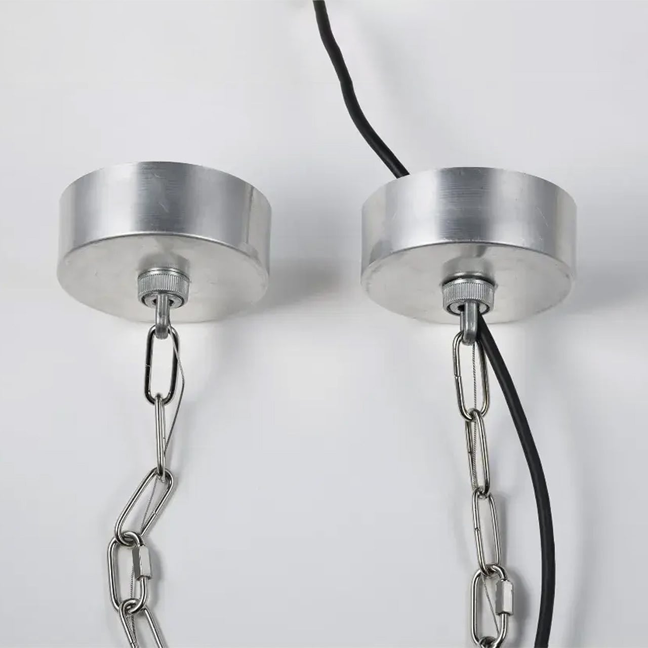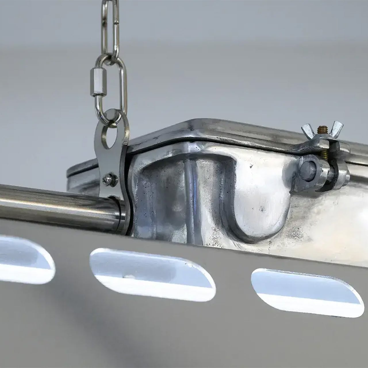 ■内容物:本体(LED蛍光灯付属)、施工説明書、吊り具一式(チェーン、落下防止ワイヤー付)× 2 ※フランジ取り付け用の金具は付属しておりません。