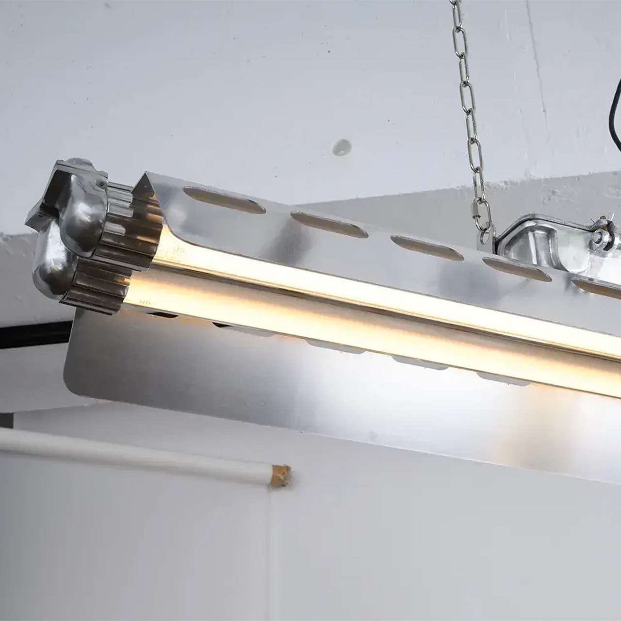 旧東ドイツ国有企業の廃墟に残る照明器具。Tube Lampシリーズは現代的なアレンジで、そのヴィンテージ照明の雰囲気をそのままに使いやすさを向上。唯一無二の存在感を放つかつての照明器具を現代照明としてリプロダクトしました。その唯一無二の存在感は、カフェやレストラン、アパレルショップなどの施設照明としておすすめです。LED蛍光灯、チェーン、フランジは日本製を使用。長寿命・省電力に加え、安心・安全性を重視。配線も国内基準に準拠した仕様です。