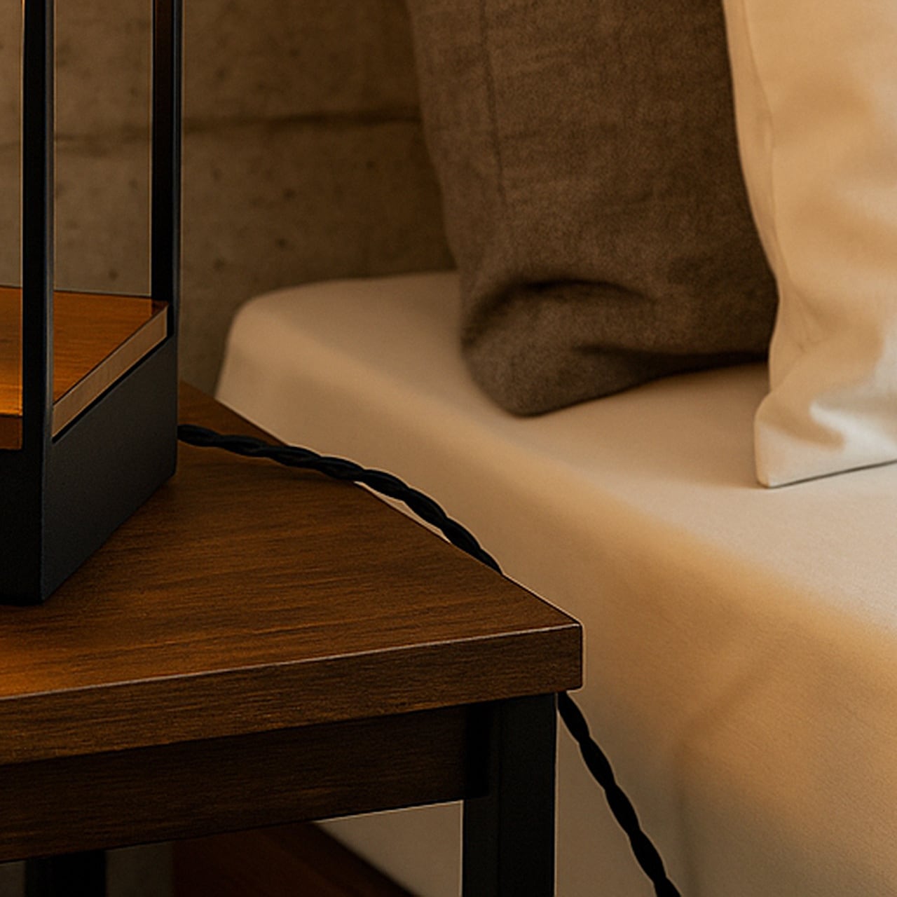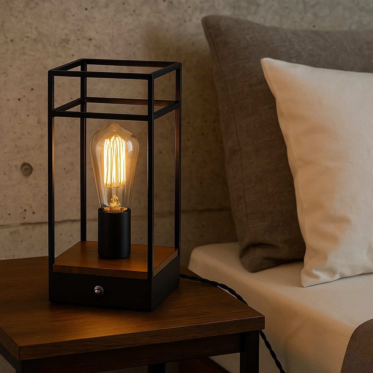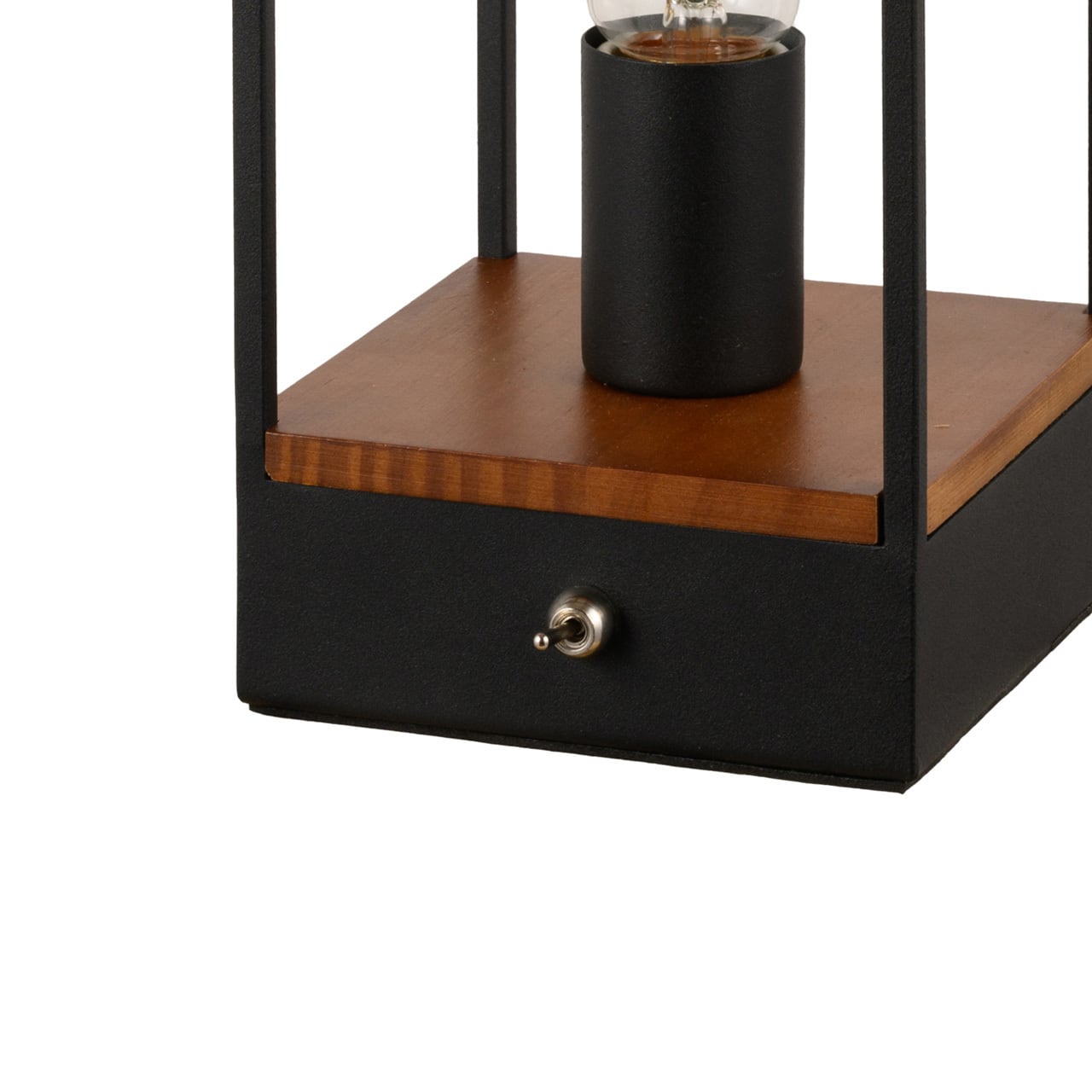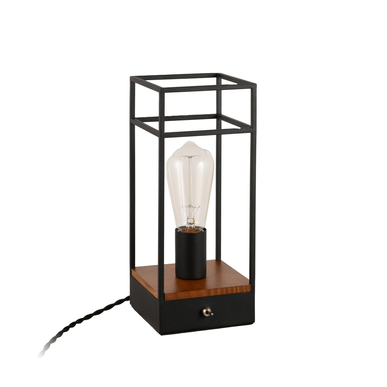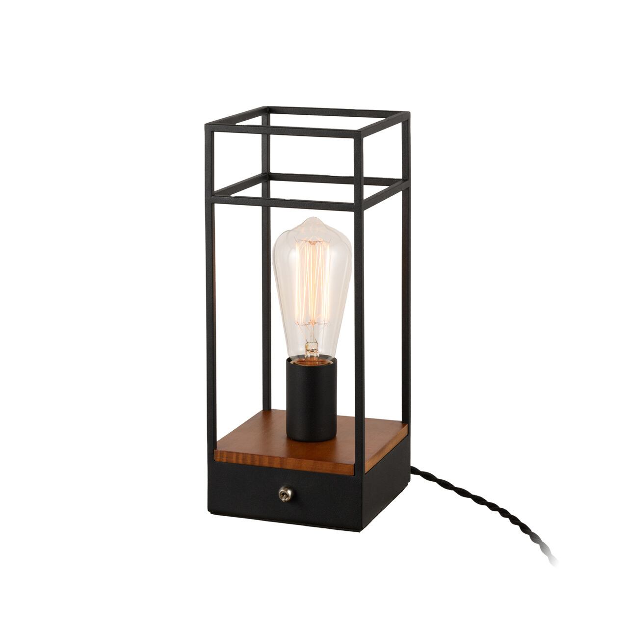 行燈のような枠を持ったレトロな雰囲気のテーブルライト。むき出しの電球がよりレトロ差を感じさせ、電球そのものの美しさも味わえます。スイッチにはトグルスイッチを採用し、この操作も趣きを感じさせます。コードにもツイストコードを使い雰囲気を高めています。一見和モダンのようにも感じますが洋室では逆にコンテンポラリーな雰囲気もあり、お部屋を問わずお楽しみいただけます。