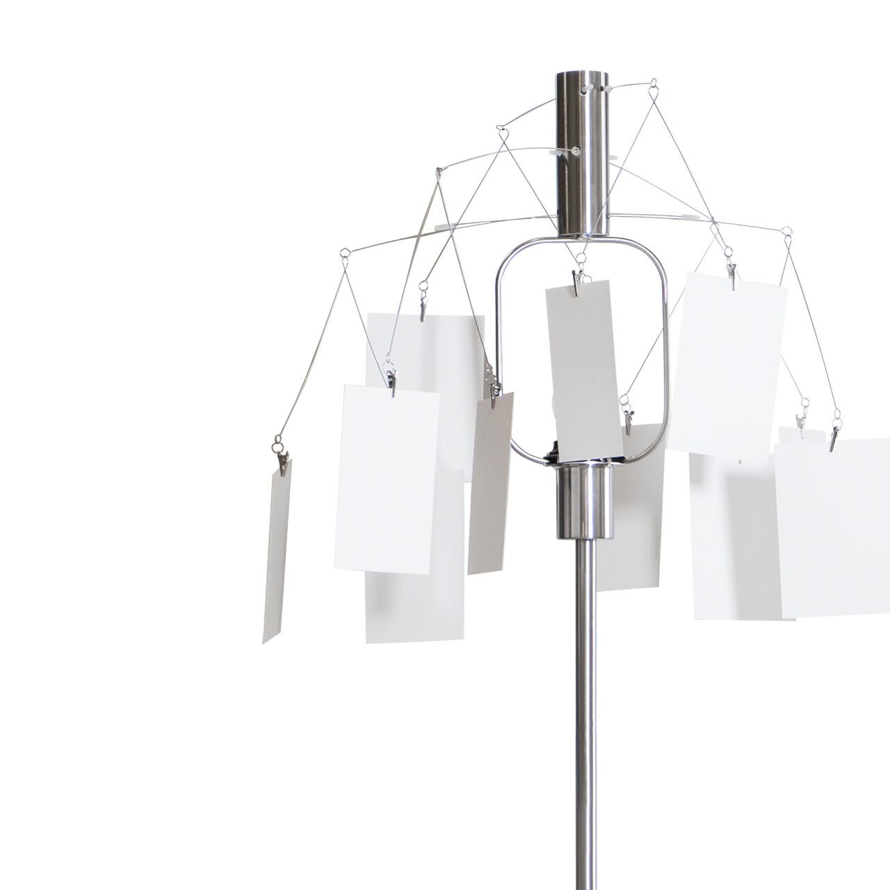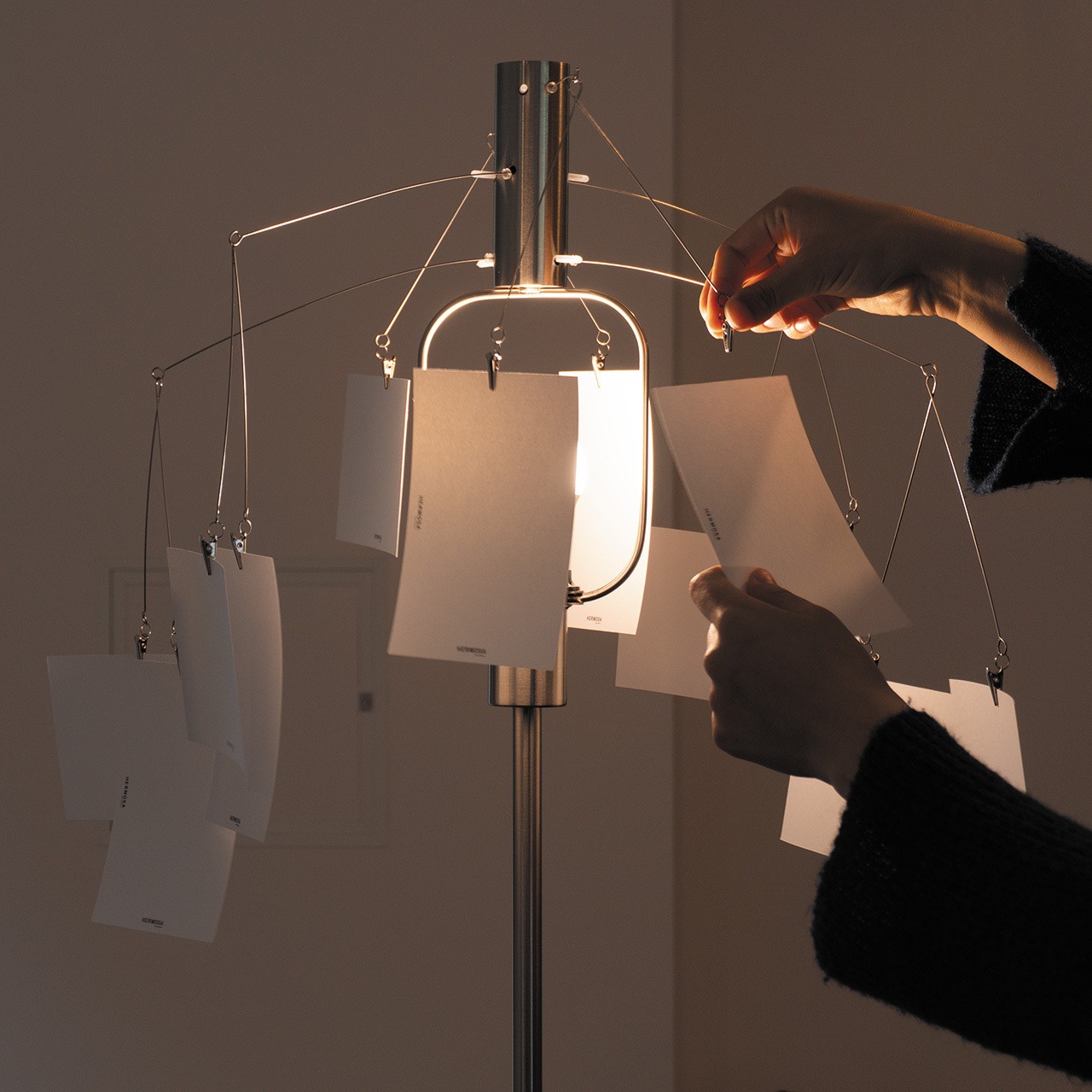 アートと照明が合わさったモビール型のフロアランプ。ヘアライン塗装の本体と繊細なワイヤーが組み合わさり、現代アートのような印象を与えます。写真やポストカードを吊り下げることができ、思い出とともにお楽しみいただけます。空間に動きや軽やかさを与えてくれ、特別な空間を演出いたします。ベットサイドやリビングコーナー、カフェやギャラリーなど創造性や個性を演出したいところにもおすすめです。