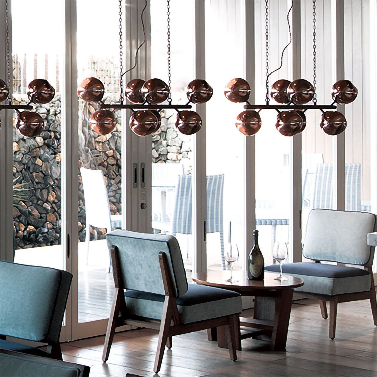 まっすぐ伸びた支柱から8つの丸みを帯びたガラスシェードが華々しく四方を照らすダイナミックなペンダントランプです。高級感のあるデザインとカラーリング。ゴールドボディにはグレーのガラス、ブラックボディにはミラーリングされたカッパー塗装が施されています。飾っているだけでオブジェのように楽しむことができるビアリッツ8はダイニングやリビングをラグジュアリーに演出します。■その他LED球使用可、スイッチON/OFFのみ(壁面スイッチにより「消灯」→「8灯点灯」→「消灯」となります。)カラビナによりチェーンの長さを短くすることが可能です。・最長で(通常)全長約1100mm・最短で全長約630mm