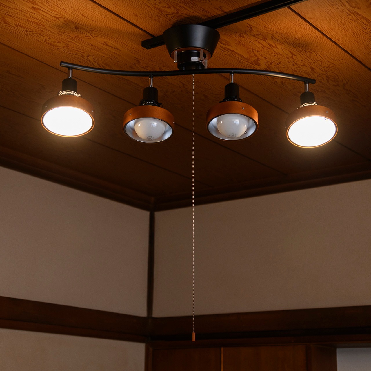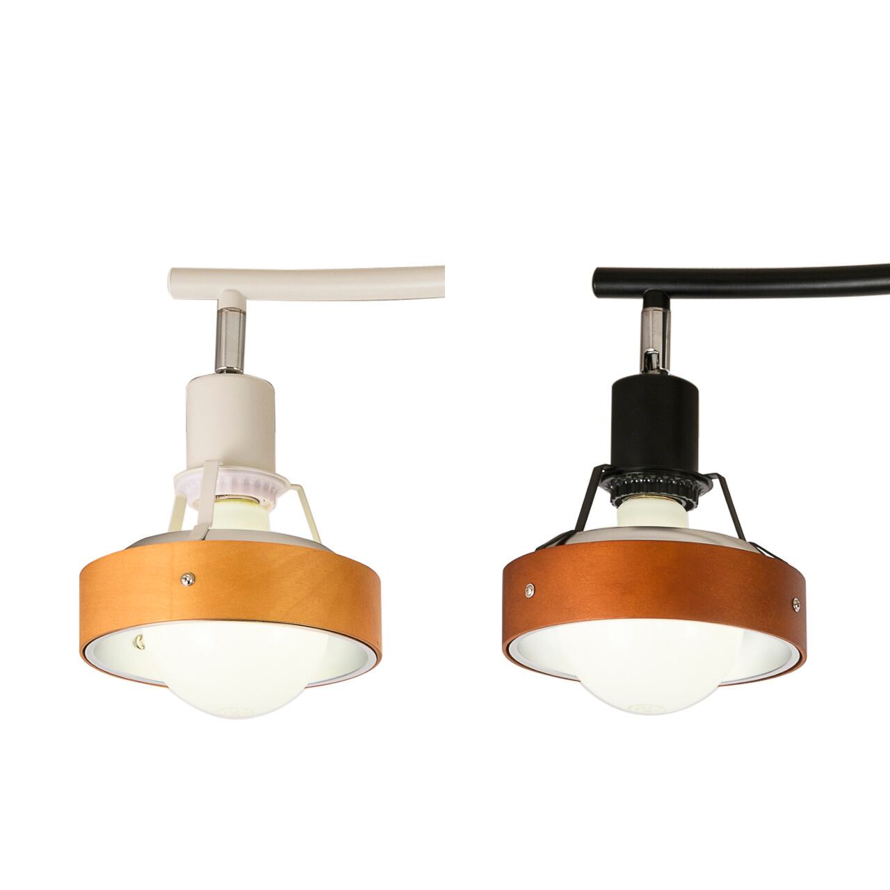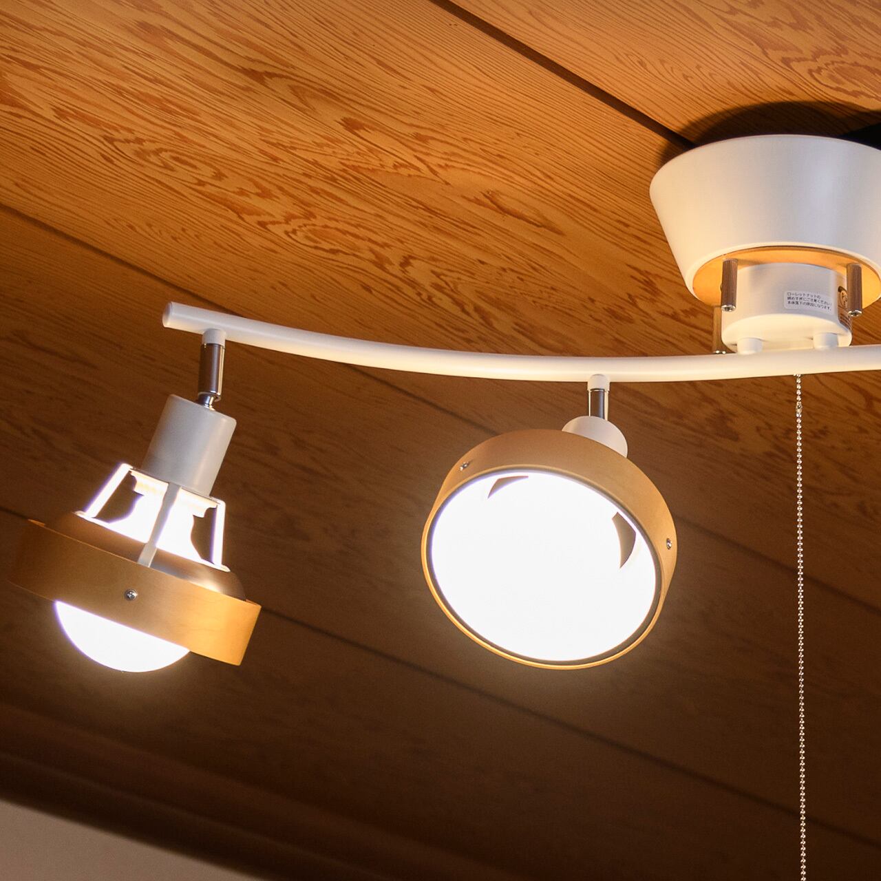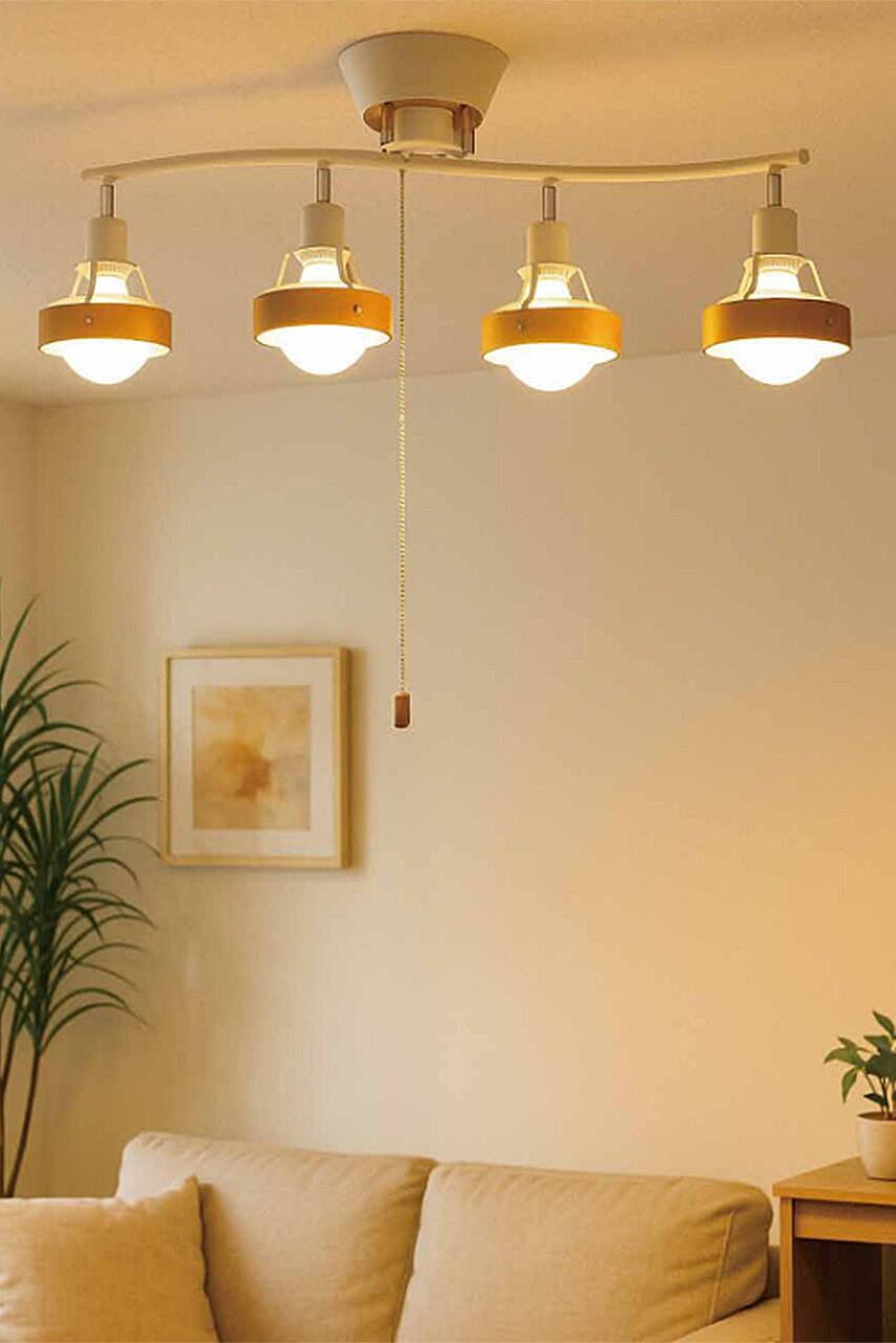 シンプルながら趣きあるカーブに木製枠を備えたスポットライトのような4灯を配置したシーリングライト。フレームは少し湾曲させることで直線で雑然としがちなインテリアにアクセントを加えています。またそこに配置された4灯の各灯具は角度調整が可能で好きな方向に光をコントロールできます。便利なプルスイッチを備え、点灯状況を切り替えることができます。ナチュラルな雰囲気の木枠を備え、温かみやスタイリッシュさといった要素を加えています。