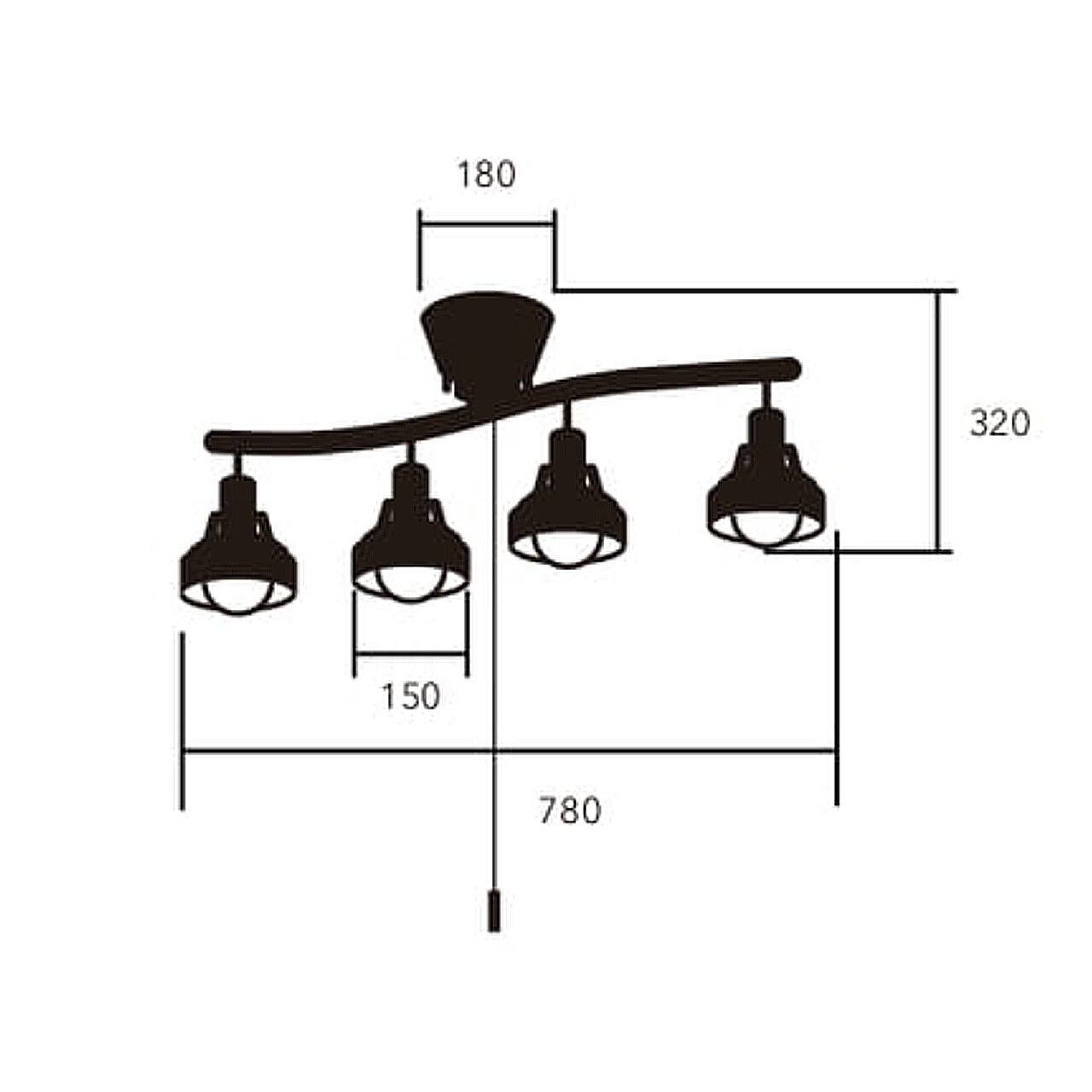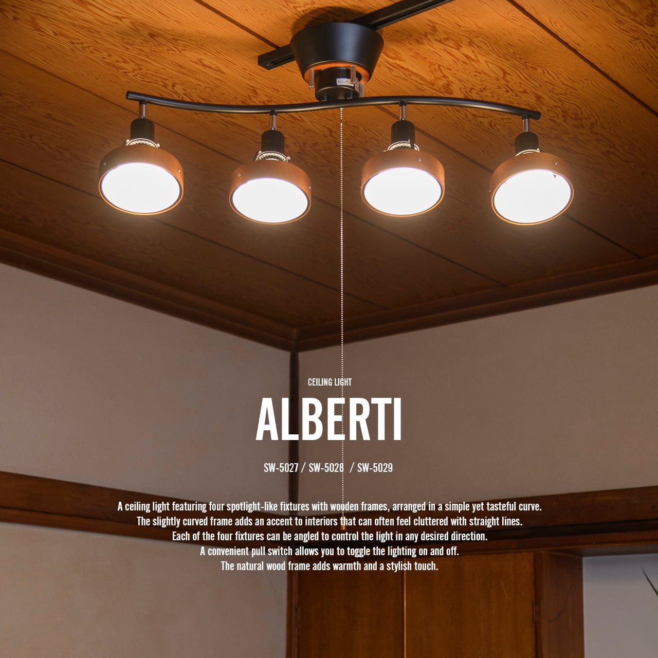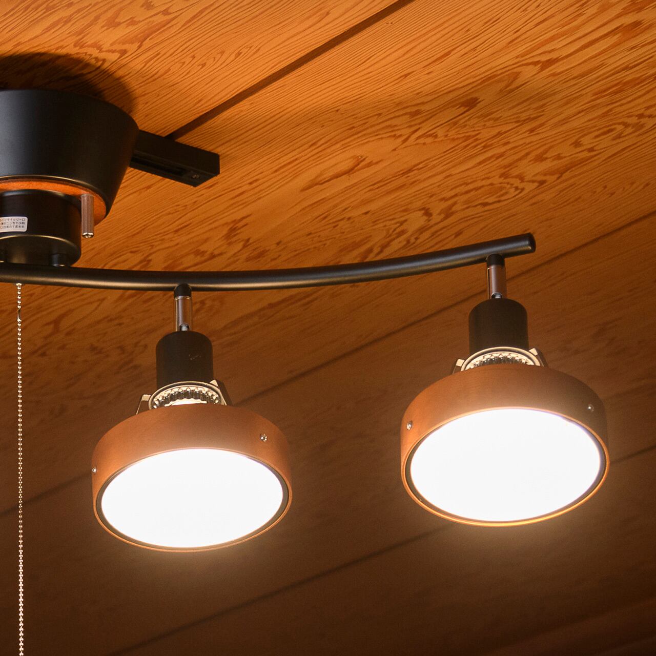 シンプルながら趣きあるカーブに木製枠を備えたスポットライトのような4灯を配置したシーリングライト。フレームは少し湾曲させることで直線で雑然としがちなインテリアにアクセントを加えています。またそこに配置された4灯の各灯具は角度調整が可能で好きな方向に光をコントロールできます。便利なプルスイッチを備え、点灯状況を切り替えることができます。ナチュラルな雰囲気の木枠を備え、温かみやスタイリッシュさといった要素を加えています。