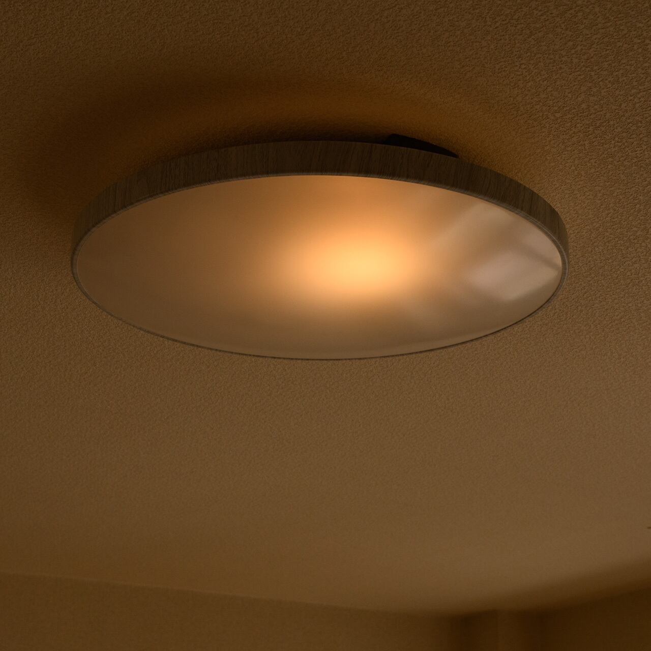 シンプルかつ薄型ながら調光と調色機能を搭載したLEDシーリングライト。調光は10段階の明るさを設定可能。調色は昼光色(6500K)〜電球色(2700K)まで11段階で切り替え可能です。付属のリモコンにより、これら切り替えの他にLED常夜灯やOFFタイマーなどの設定が可能。シェード側面はシンプルな中にナチュラルなアクセントを添える木目塗装を施した3種のパターンをご用意。