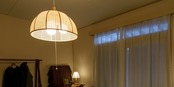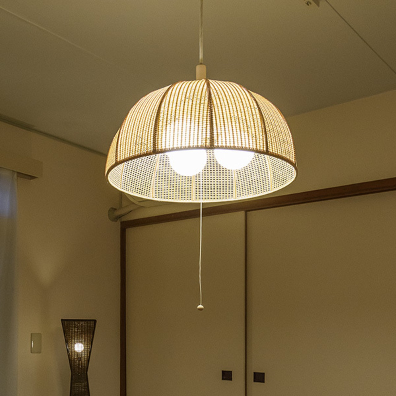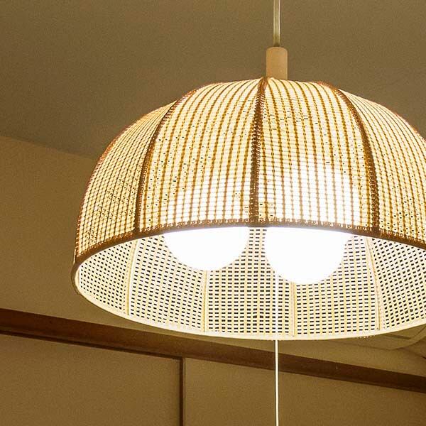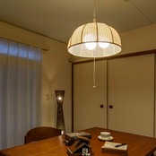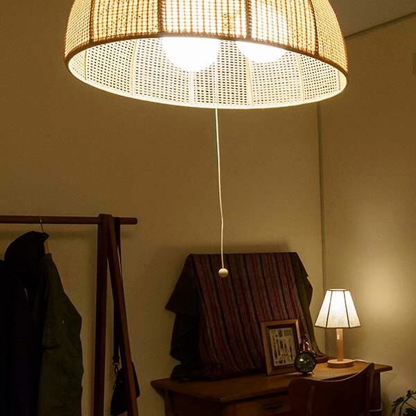 特殊紙ウィッカーであしらったお椀型半円のペンダントライト。メッシュから漏れる光は柔らかく、穏やかにお部屋を演出します。シンプルオーソドックスで、素材感と相まって和洋いずれの空間にも合わせやすくなっています。ペンダントとしては明るい、100W×3灯仕様の灯具を採用。8畳程度までをカバーできます。また、壁面スイッチのON/OFFに加えて、プルスイッチ装備で3灯→1灯→常夜灯→消灯の切り替えが可能。