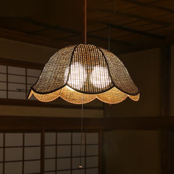 特殊紙ウィッカーであしらったナポレオンスタイルのペンダントライト。メッシュから漏れる光は柔らかく、穏やかにお部屋を演出します。トラディショナルな趣きで和洋いずれにも合わせやすいデザインです。付属の電球はホワイト球ですが、お好み応じてクリア球を使えば壁面に投影される影も美しい。