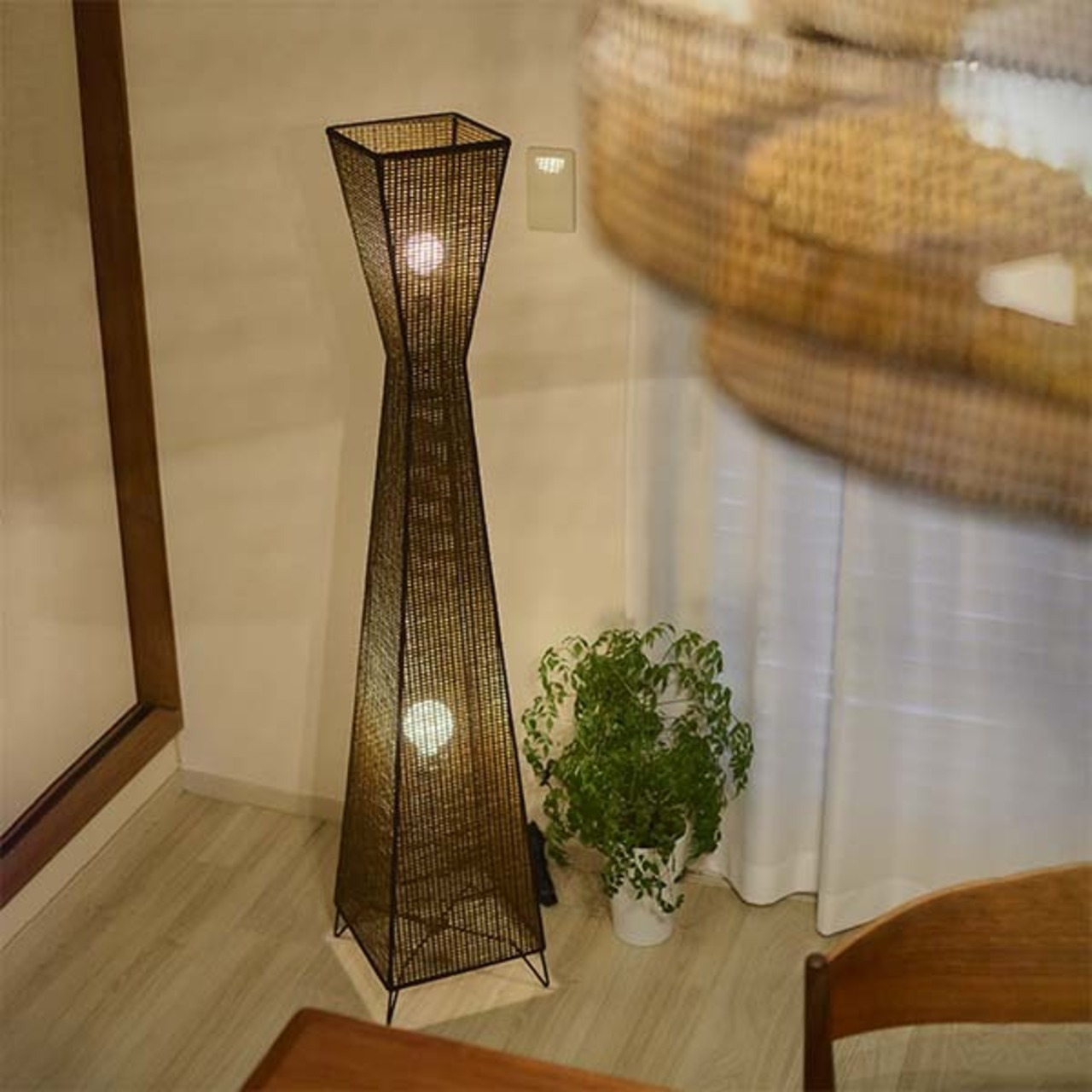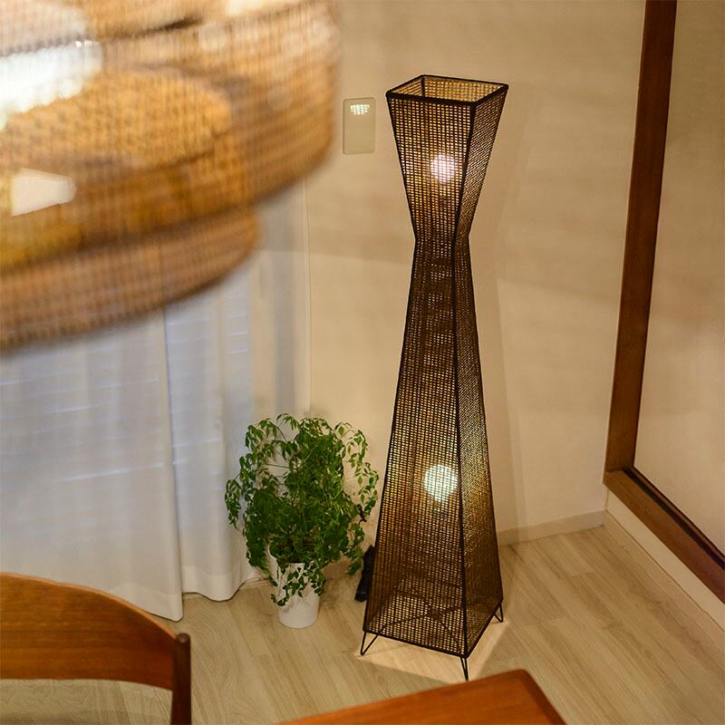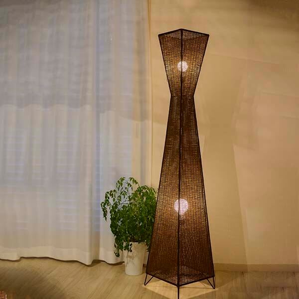 インテリアのオブジェクト要素として存在感を放つフロアライト。上下2灯の発光で、全体のアウトラインを浮き彫りにし、その名の通りタワー感を演出しています。ラタンの様なメッシュ状の表面からこぼれる光は柔らかく、穏やかに空間を照らします。和モダンの要素もあり、和洋問わずご利用いただけます。