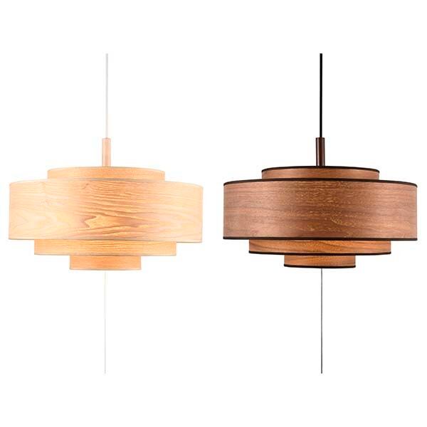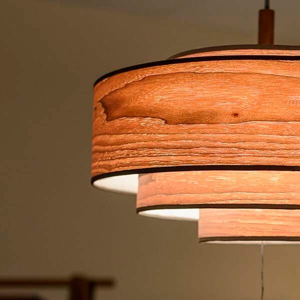 木目の美しさを存分に味わえる、突板をシェード素材に使用しレイヤーさせたナチュラルながらもモダンなペンダント。突板を透過した光は美しい木目を際立たせるだけでなく、柔らかで穏やかな空間を演出します。シェードは大小4つのレイヤーとし、モダンな雰囲気を演出しています。ペンダントとしては明るく、100W×3灯仕様で常夜灯も装備。プルスイッチで3灯→1灯→常夜灯→消灯と切り替え可能。
