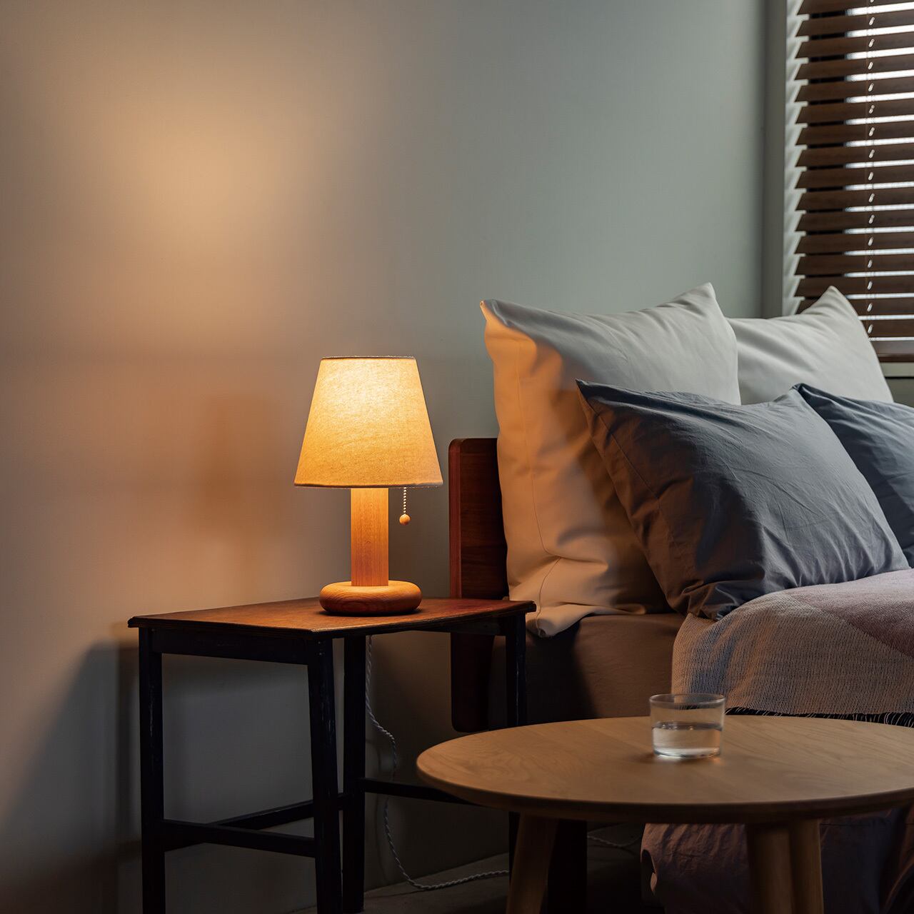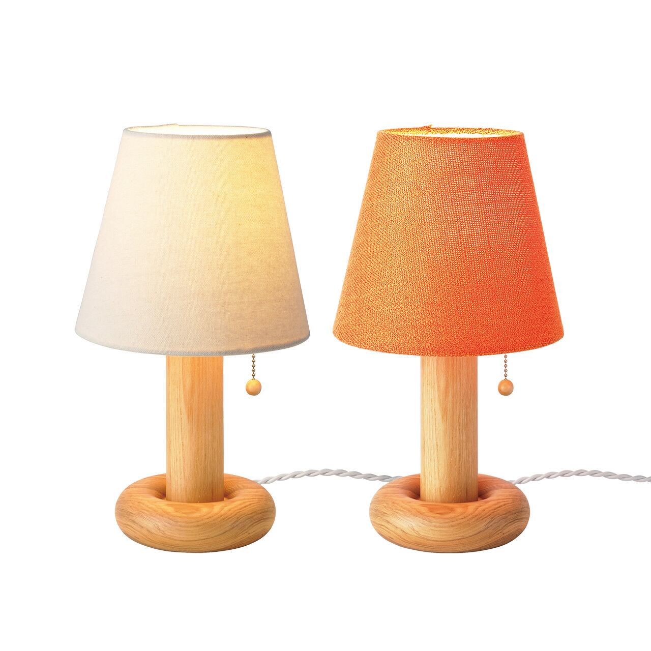 ベッドサイドやリラックススペースを照らしてくれる、ナチュラルでかわいい存在に心がほぐれます。贅沢に木を削り出して作る、もっちりとしたドーナツのようなベースは滑らかな手触りが自慢です。点灯時は優し気なファブリックシェードを通して穏やかなグラデーションとなって柔らかな光が広がり、消灯時はその愛くるしいルックスがマスコット的なインテリアとしてパーソナルスペースを演出します。先端にも木をあしらったプルスイッチ。その操作も趣ある時間を感じます。お部屋の雰囲気やお好みに合わせて、馴染みのいい生成りのアイボリーとレトロポップなオレンジの2カラーをご用意。