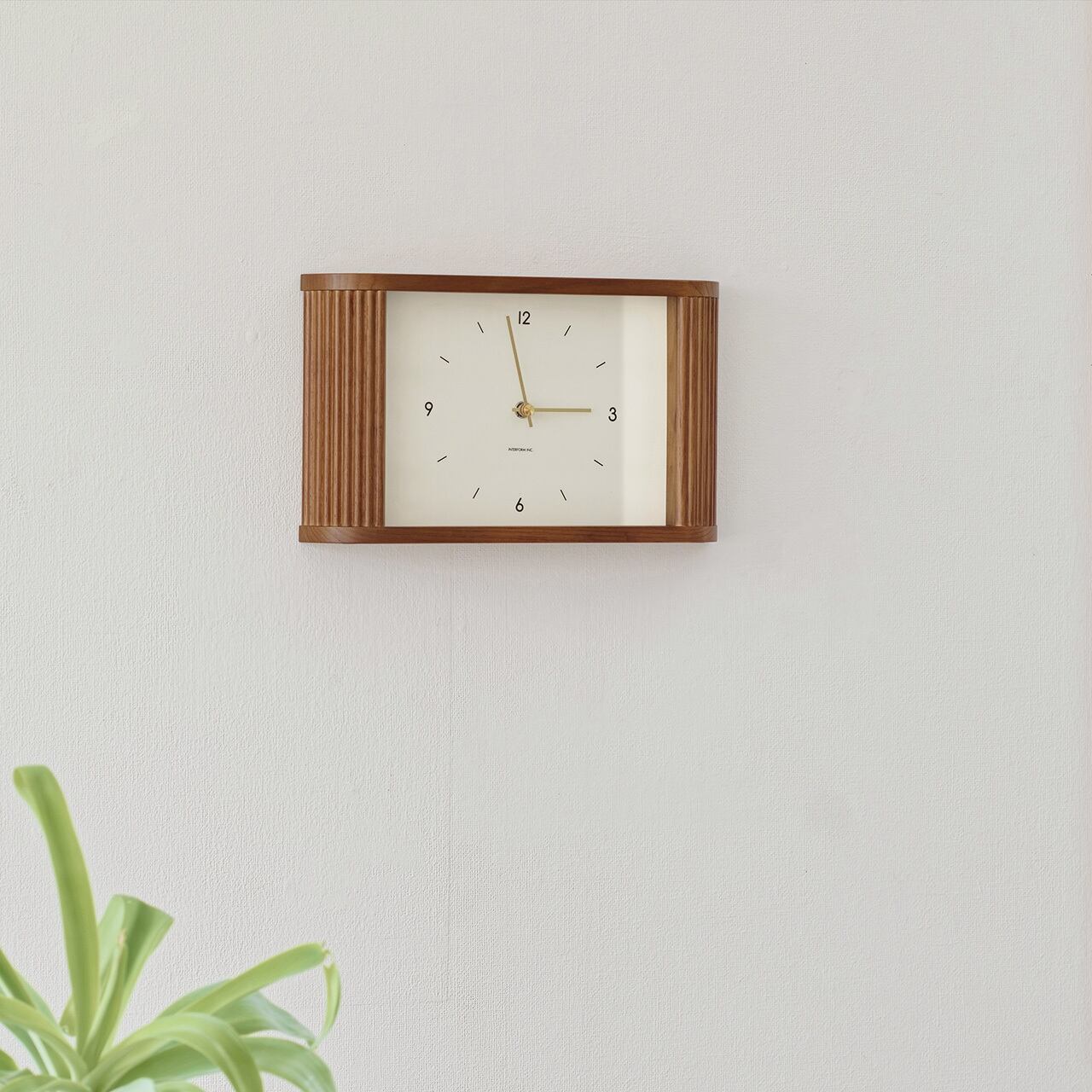 深い色味のウッドフレームに丸みのある凹凸装飾を施した置き掛け兼用のデザイン。両サイドに向かって緩やかにカーブする、立体感のあるデザイン。柔らかな印象を与えるアイボリーの文字盤にゴールドの針と小さな数字が上品な華やかさを添えています。木をたっぷり使ったリッチなナチュラル感は、まるでヴィンテージ家具のような佇まいです。和室にも合わせやすいシックな佇まいで、置時計としてもお使いいただけます。