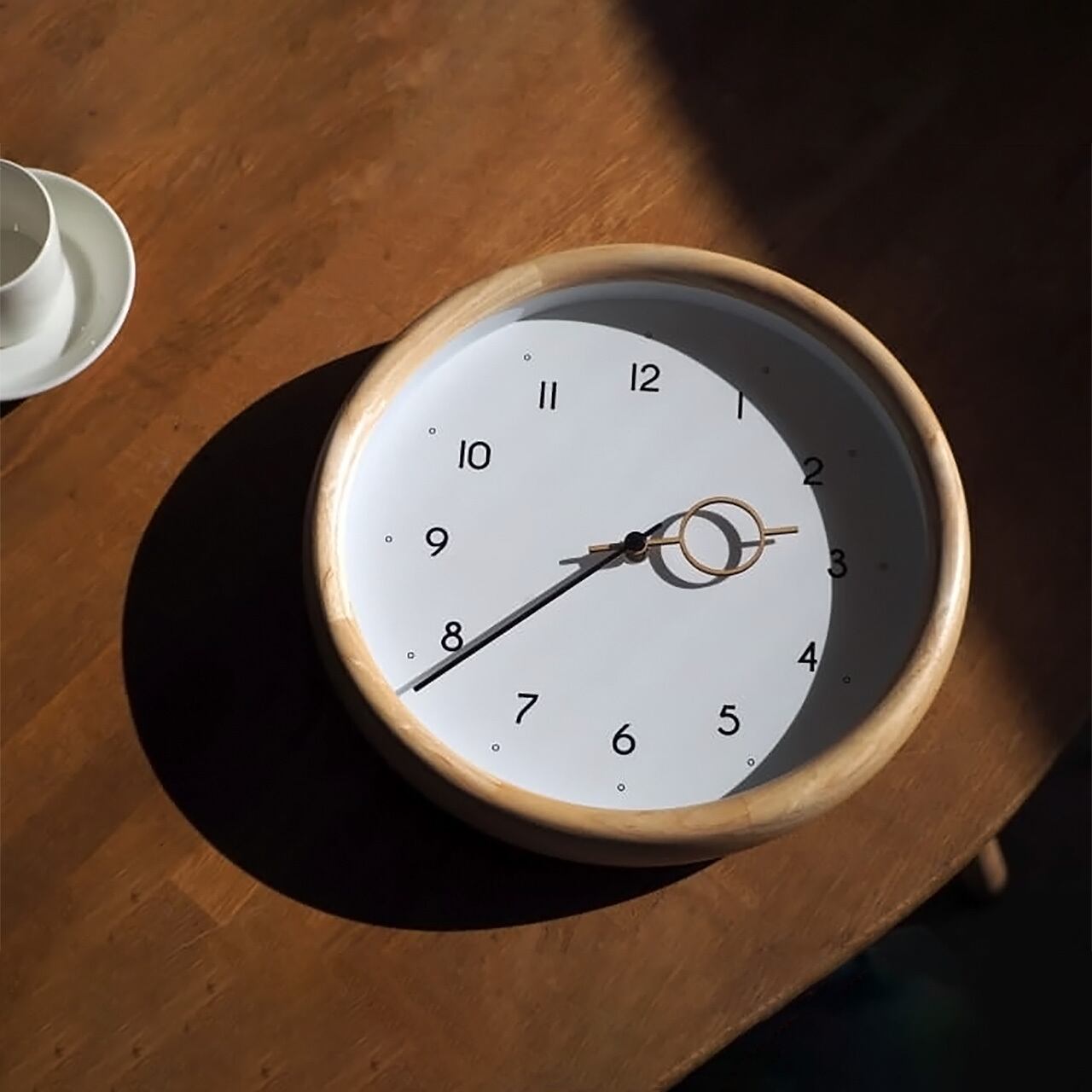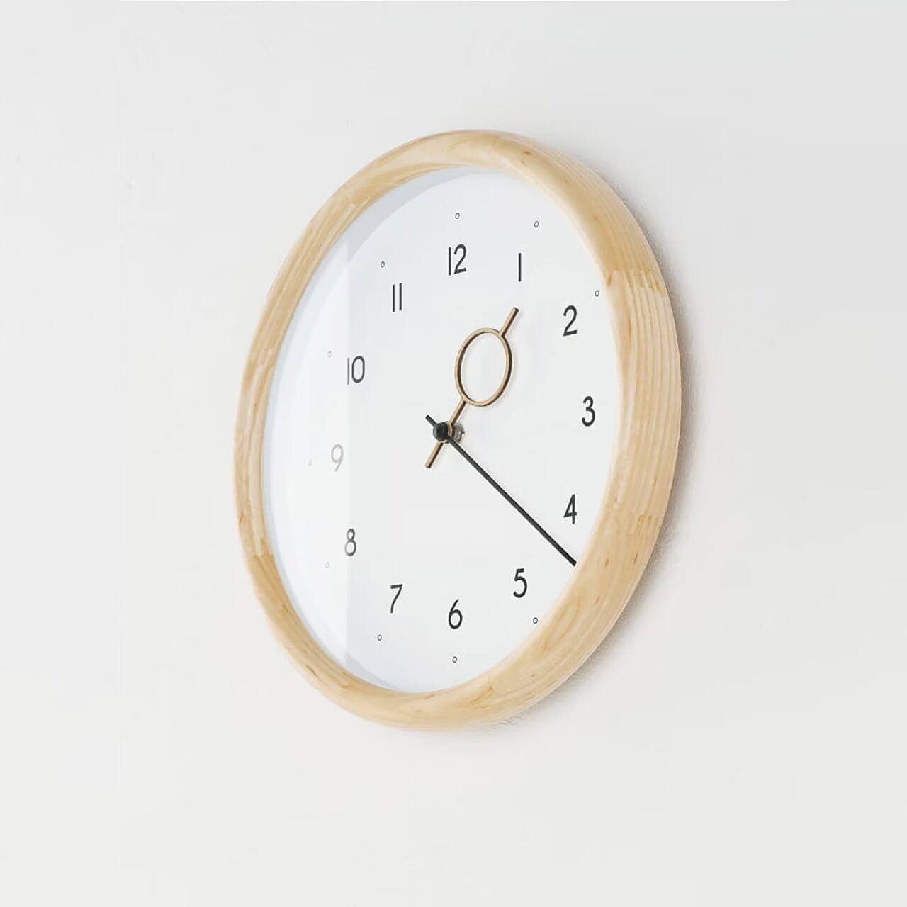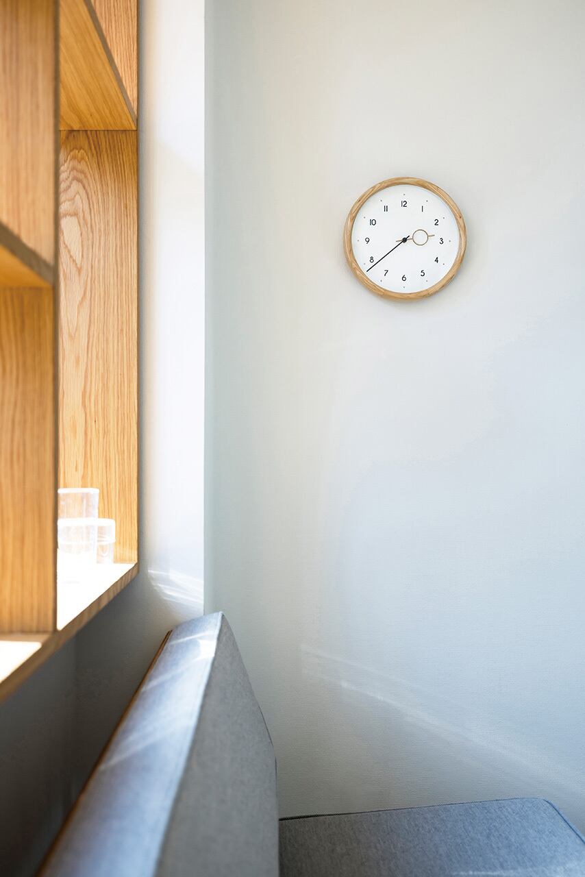 ドーナツのようなふくらみを表現した立体的なウッドフレーム、インデックスの文字や針にも丸みを取り入れて穏やかな表情にこだわった、ナチュラルで心地よい掛け時計。家具の素材としても人気のアッシュ材を使用し、丁寧に仕上げられたフレーム。滑らかな手触りが、木の持つやさしいぬくもりを引き立てています。王道でありながらもこだわりを感じられるデザイン、すっきりとしたルックスでクリアな視認性。ナチュラルモダンなデザインは毎日のシーンにしっくりと馴染んでくれます。