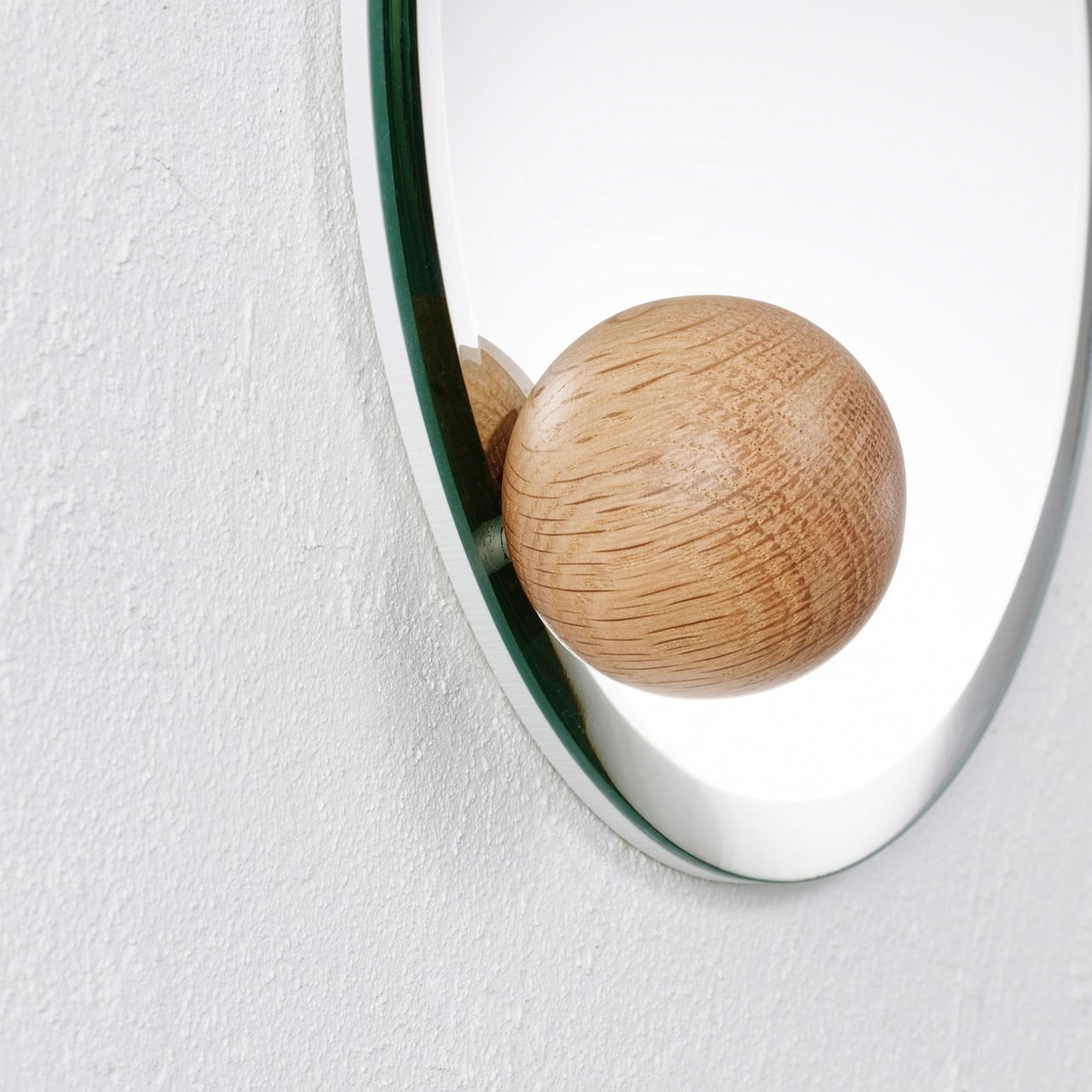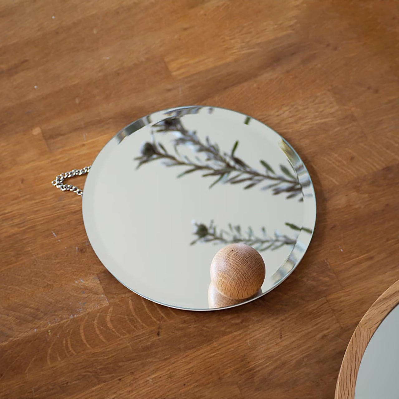 アシンメトリーにちょこんと添えたウッドボールが浮遊感を感じさせるオブジェのような遊び心たっぷりのインテリアミラー。ガラス縁に施したカッティングが鏡に映る景色を新鮮なものにしてくれます。玄関やトイレなどでちょっと身だしなみを整える用にも適したちょうどいいサイズ感で、インテリアのアクセントアイテムとしても有用です。シルバーチェーンがついているので、引っかけるだけの簡単設置。ナチュラルでポップなときめきデザイン。お気に入りの場所にそっと添えて、気分を盛り上げてくれます。