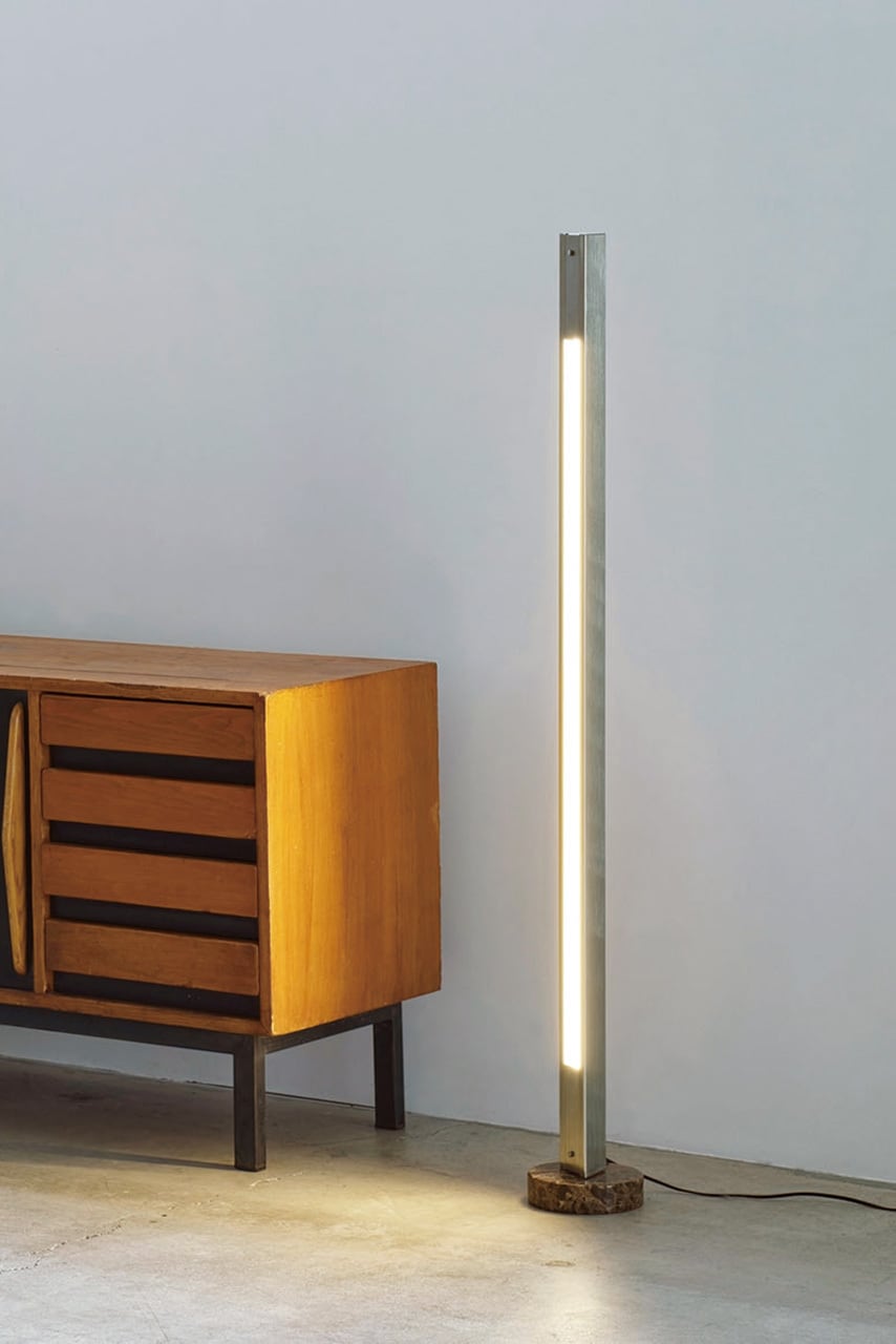 ソファ横などに縦置き、床に横置き、部屋のコーナーや壁面に向けて間接照明にと、多様な使い方が可能なマルチなフロアライト。どこから見ても隙のないトライアングルデザインが、余白を美しく見せながら空間をスタイリッシュに演出します。大理石でできた2種類のベースが付属し、縦でも横でも使えるうれしい2Way仕様を演出します。また、冷たさを持つアルミ素材の本体と、あたたかみのある大理石のベースのコントラストが互いを引き立てます。