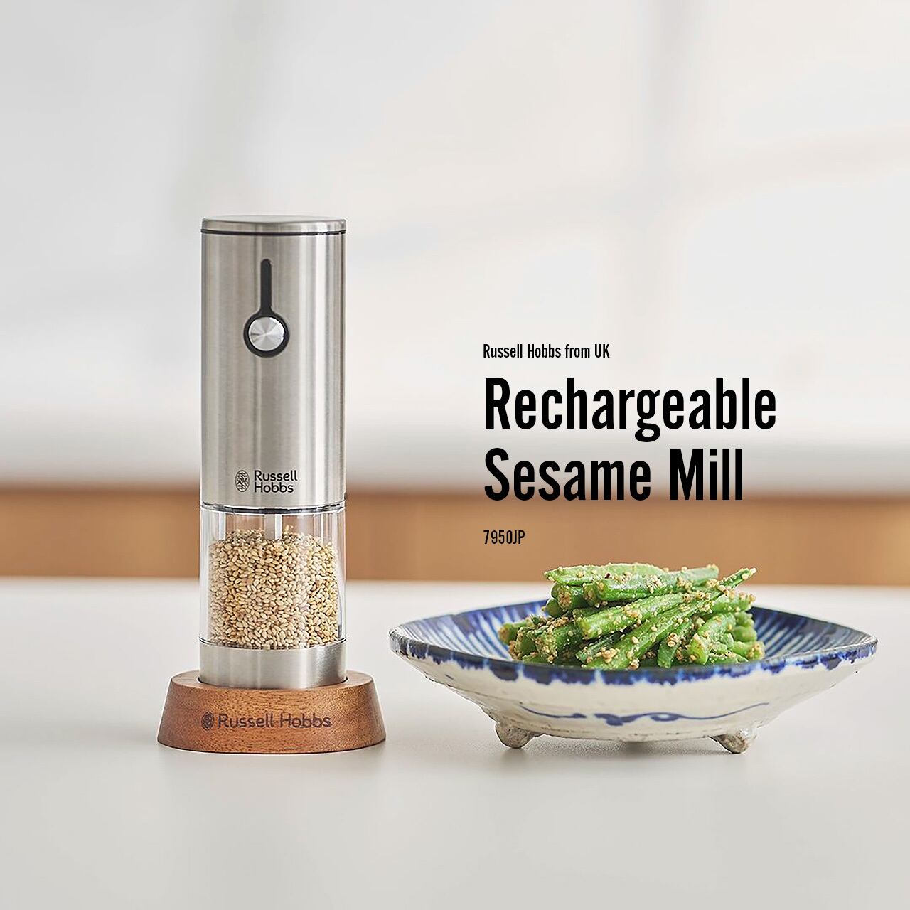 Russell Hobbs ラッセルホブス Rechargeable Sesame Mill 充電式ゴマミル 7950JP / ゴマすり器 胡麻擦り器 ごますり器 電動 USB充電 擦り目調整 LEDライト付き セラミック刃 ウッドスタンド付き
