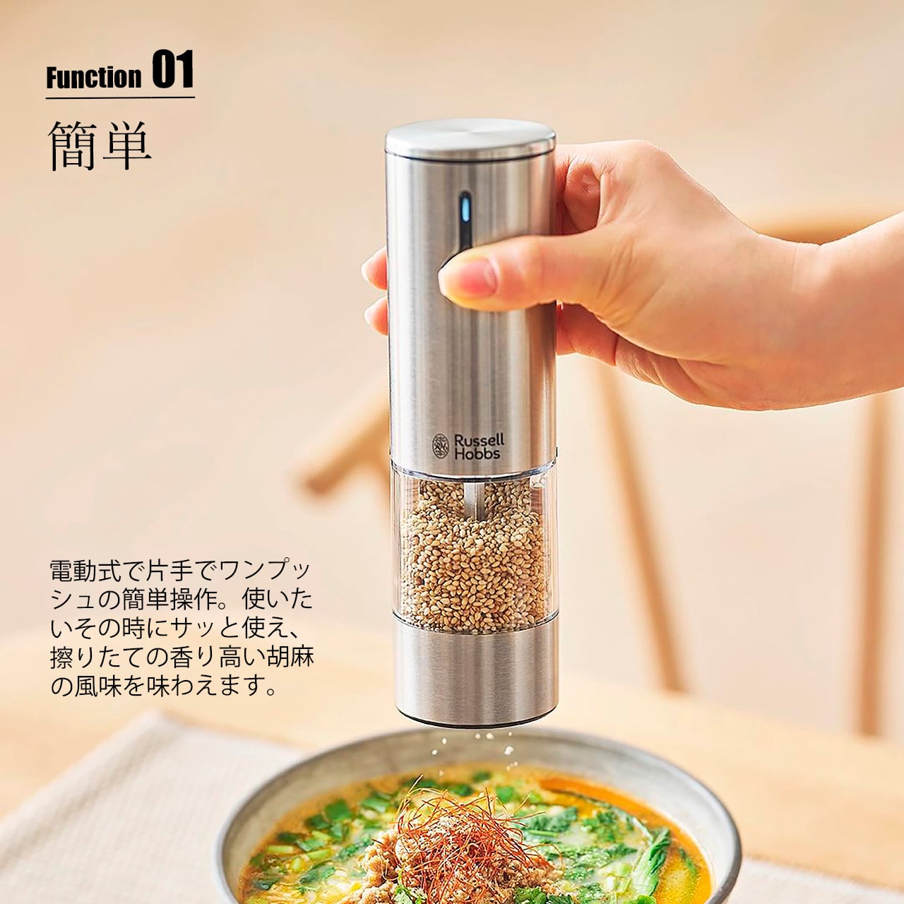 擦りたてのゴマは風味がよく、ゴマの旨味も感じやすくなるので食が進みます。一方、ゴマは擦った時点からの酸化によって、味も栄養価も速いスピードで落ちていきます。ラッセルホブスのゴマミルを食卓に常備しておけば食べる直前に擦ることができるので、ゴマの香りと、高い栄養素をしっかり味わいながら食事を楽しむことができます。充電式で乾電池の交換や廃棄などのストレスなく、操作も片手でワンプッシュ。動作中はLEDが点灯し、キャビン内の残量や手元が見やすくなっています。臼部分は摩擦熱が生じにくく、錆などの心配もないセラミック製。転倒を防ぐウッドスタンドも付属しています。
