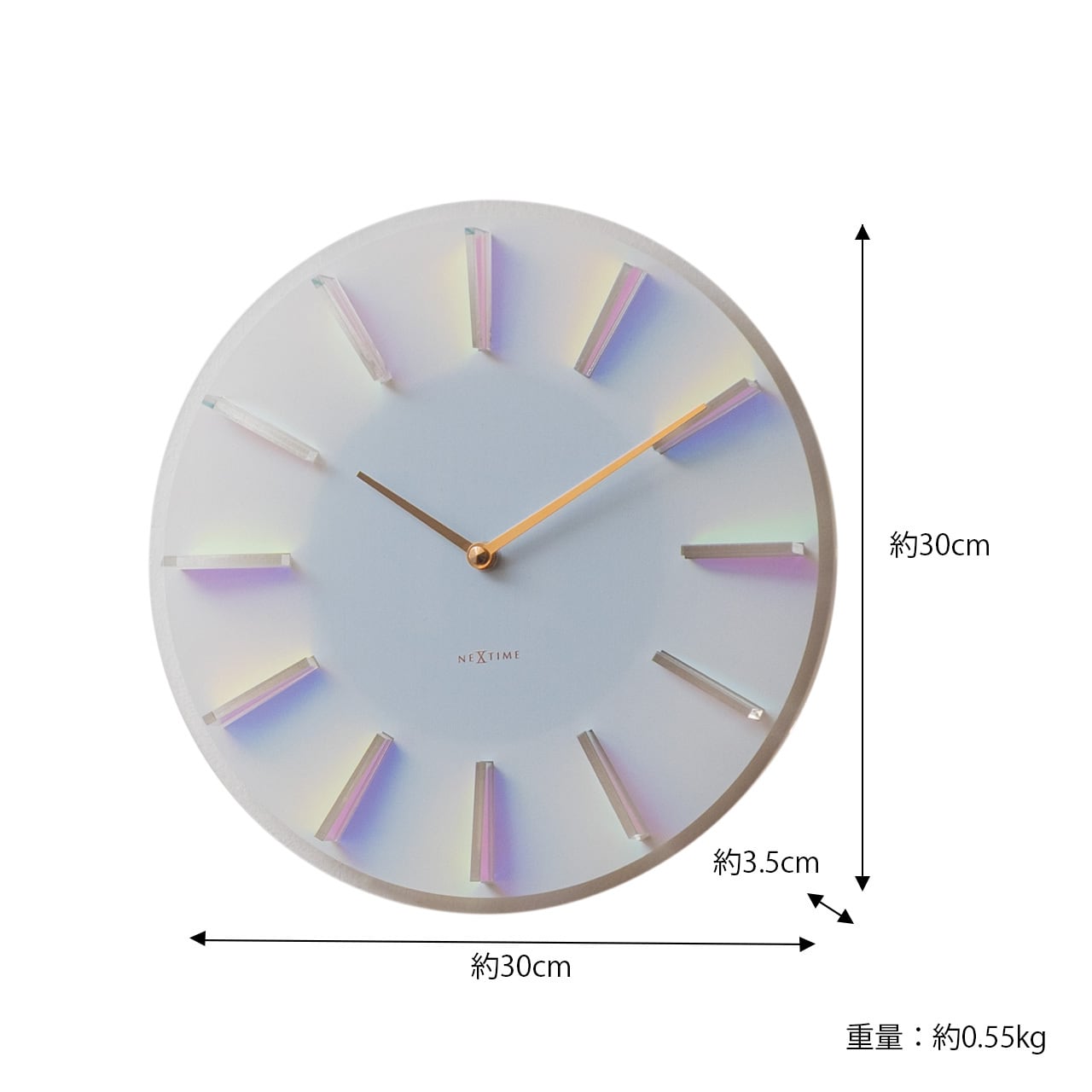 アクリルのインデックスが光を受けて虹色に反射し、空間にやさしい彩りを添えるウォールクロック。シンプルな中に幻想的な表情とどこか爽やかさも漂わせ、飾る場所や空間、時間帯や見る角度によって、その表情は静かに変化します。 光と空間のなかで、 時を刻むアートピースとして空間を彩ります。
