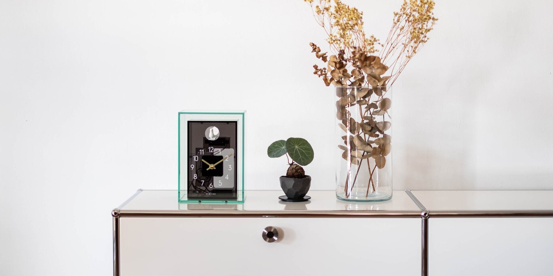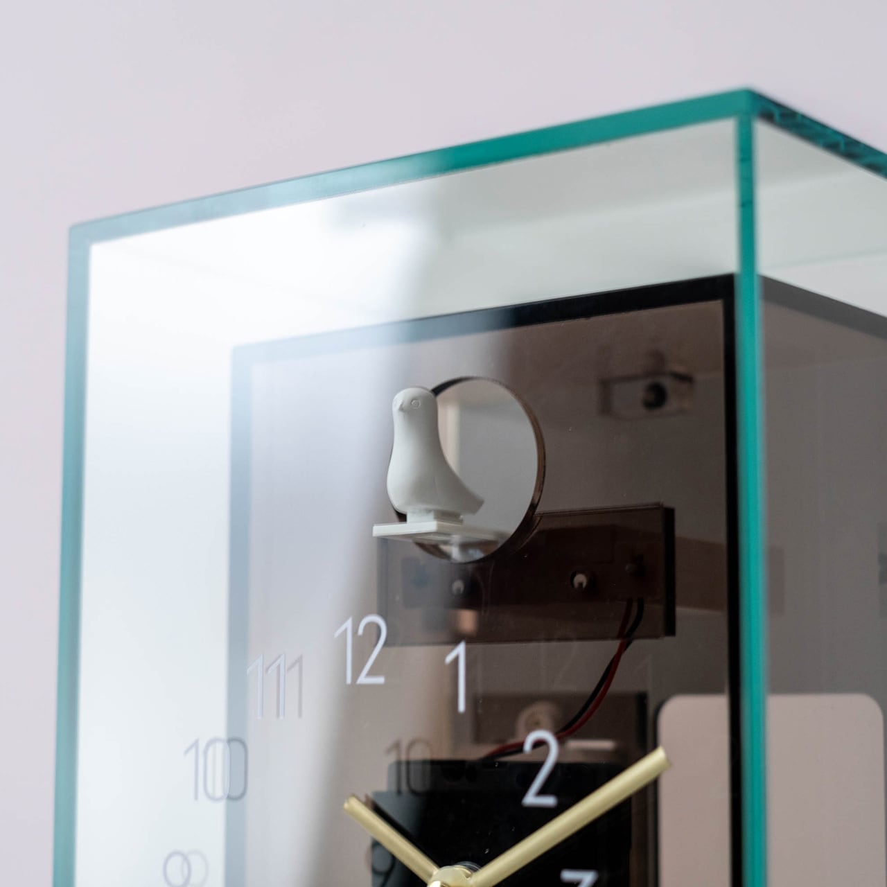 クラシカルな鳩時計の愛らしさを、シャープなアクリルケースに収めたレトロフューチャーデザイン。 エッジの立った透明アクリルとスモークパネルの奥から、小さな鳩が時を告げる姿は、懐かしさと新しさを同時に感じさせます。真鍮色の針とミニマルな文字盤が、未来的な直線の中に温かみを添え、置くだけで空間を引き締める存在感に。時を刻む機能を超えて、暮らしに静かな物語をもたらすオブジェのような時計です。