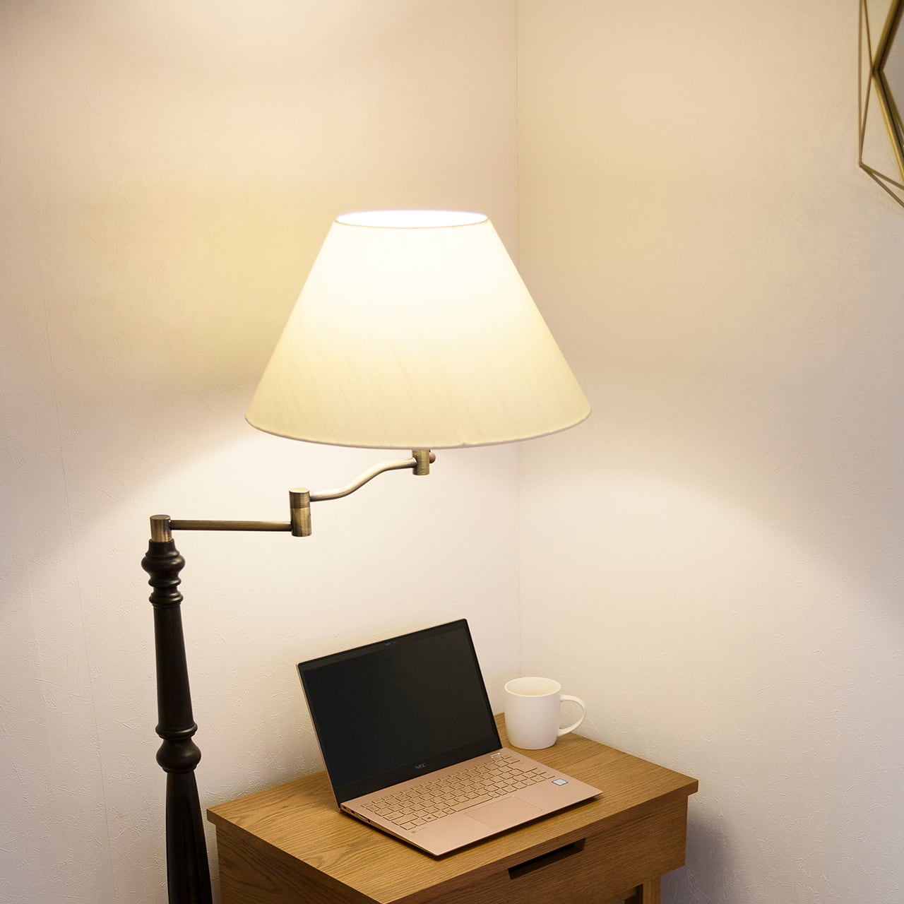 シンプルでオーソドックスなフォルムに、洗練された佇まいを備えたフロアライト。シェードにはやわらかな光を広げるファブリック素材、本体には天然木を使用し、自然素材ならではの温もりを感じられるデザインです。主張しすぎない美しさで、リビングや寝室、書斎などさまざまなシーンに自然と溶け込み、空間全体を心地よく照らします。時代やインテリアのテイストを問わず、長く愛用できる一台です。アームは可動式で、手元に光を寄せることも可能。リビングや寝室の間接照明としてはもちろん、読書灯としても有用。