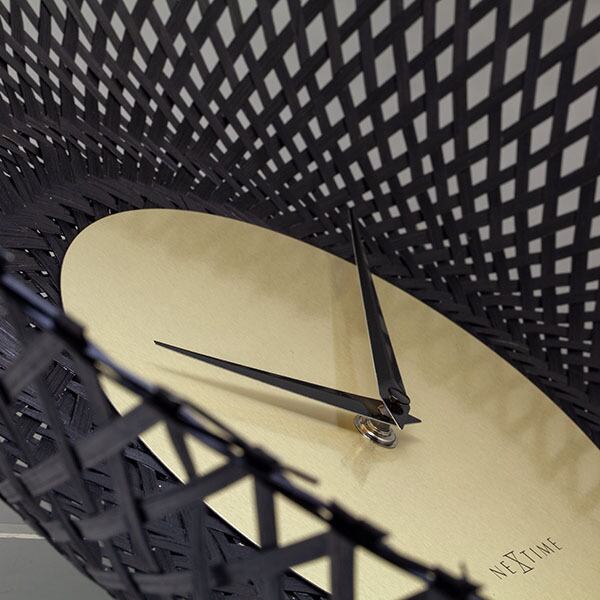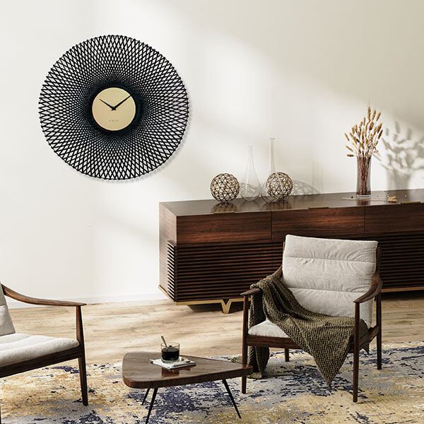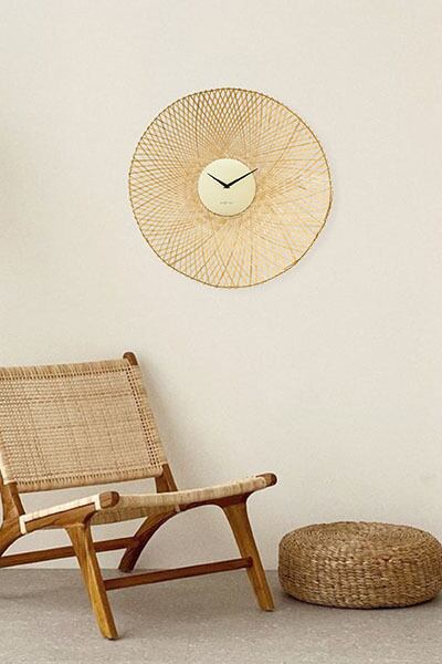 美しく編み上げられたバンブー(竹)素材が印象的で直径60cmと存在感ある掛時計。自然素材と幾何学的なアート性を融合させた、エキゾチックな魅力あふれる雰囲気を纏っており、ナチュラルな風合いの中に個性が光るデザインとなってます。「Vortex」は「渦」や「渦巻き」の意。幾何学的な編み目は連続性という美しさを作り出し、竹カゴのようなクラフト感が共存するオリエンタルな要素も併せ持ち、和モダン、アジアンなお部屋にもマッチします。