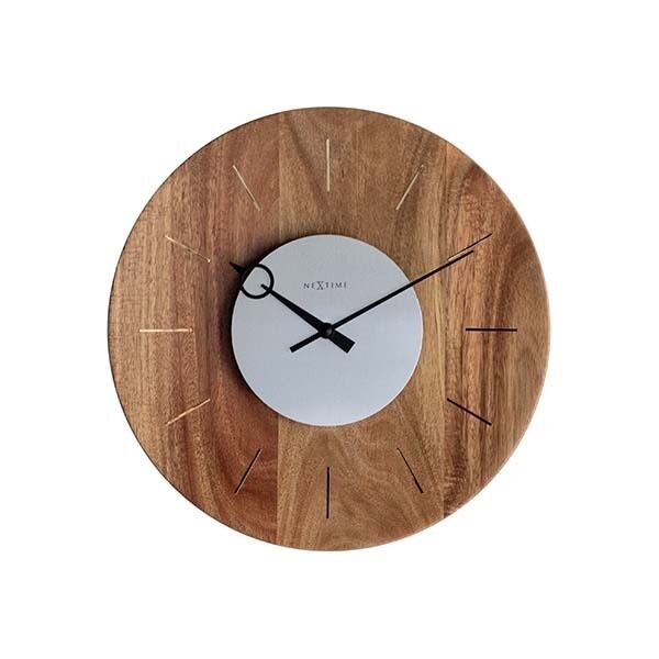 自然素材とモダンなデザインを融合させた壁掛け時計です。 温かみのあるウッド素材が、シンプルで洗練されたラインインデックスと調和し、視認性と美しさを両立させています。 中央のシルバーのプレートがデザインに深みを加え、時計全体にバランスの取れた印象を与えます。 黒の針がシンプルな美を強調し、どんなインテリアにも自然に馴染みます。