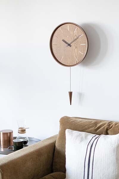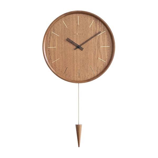 自然素材とミニマルデザインが融合したエレガントな壁掛け時計です。 美しいウッドフレームとシンプルなメタルインデックスが、洗練された印象を与え、どんなインテリアにも自然に溶け込みます。長く伸びる振り子が、時の流れを静かに演出し、空間に心地よいリズムをもたらします。ブラックの針と細部にまでこだわったデザインが、タイムレスな美しさを提供します。