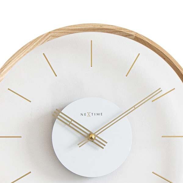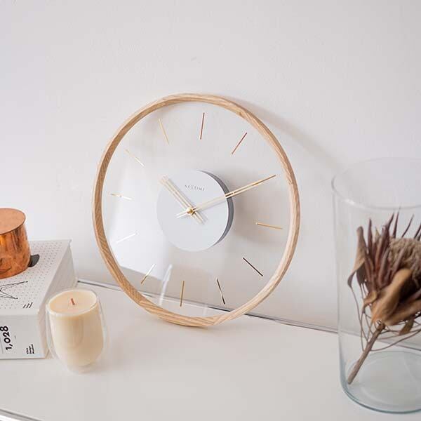 アクリル文字盤に浮かぶゴールドのインデックスが、時間の流れを優雅に演出する壁掛け時計。透明感のあるデザインが空間に軽やかさをもたらし、ナチュラルな木製フレームとのコントラストが、シンプルでありながら視覚的なインパクトを生み出します。