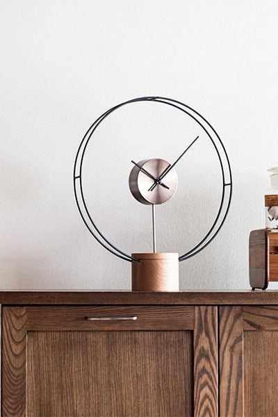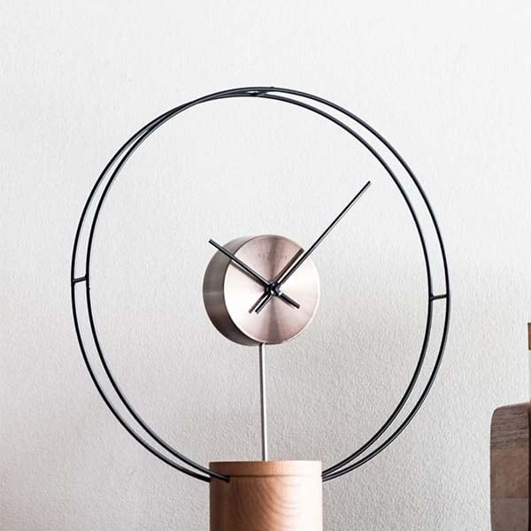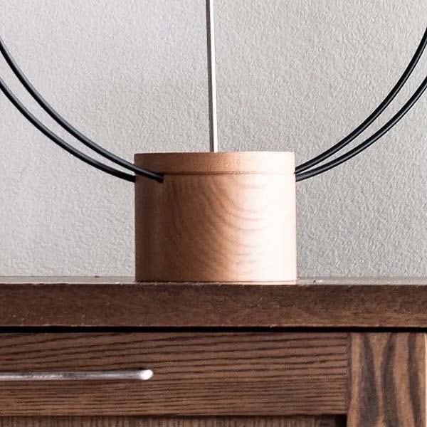 あたかも浮遊しているような中心のムーブメントピース。その周りを巡回する衛星軌道を模したようなリング。ソリッドの木を惜しみなく使用した重厚感のあるベース。それらが絶妙なバランスで組み合わさり、まるでアート作品のオブジェのようなデザインに仕上げています。