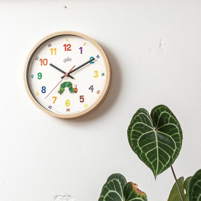 ベストセラー絵本『はらぺこあおむし』が代表作として知られる絵本作家 「エリック・カール」の掛け時計です。彼の特徴的なイラストは独創的なコラージュ技法で描かれます。彼自身が彩色した紙を切り取り、重ね、組み合わす事で、思いがけなく複雑で鮮やかな色彩を生み出しています。そんな彼の世界観を掛時計に込めました。秒針にはカチカチ音が鳴らないスイープムーブメントを採用していて、寝室や仕事部屋など静かに過ごしたい場所に最適です。