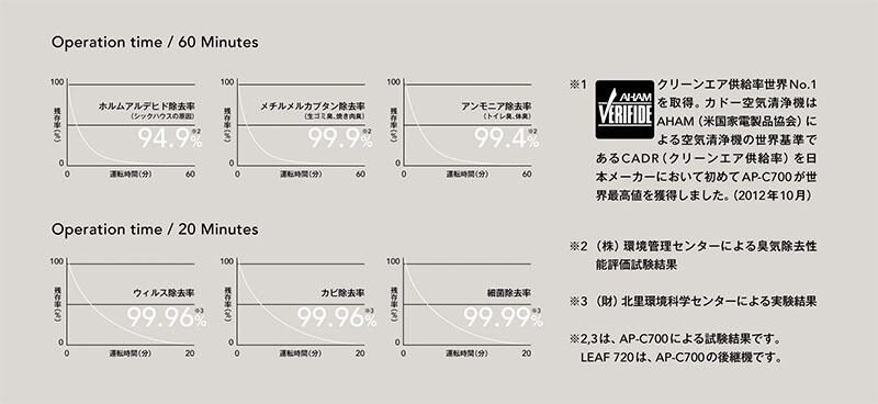 すべてが美しい。洗練を極めたフラッグシップモデル。カドーは日本メーカーで初めて世界 No.1 の空気清浄能力を実現。米国家電製品協会(AHAM)の定める「CADR( クリーンエア供給率)」において、初代カドー空気清浄機「AP-C700」が世界最高値を獲得し(※)、 初代を踏襲した「LEAF720」も世界最高値を取得し続けています。世界最高レベルの美しい空気を生み出すカドー空気清浄機、その確かな性能をお約束します。 ■適応床面積 〜107m(65畳)※日本電機工業会規格JEM1467に基づく試験方法により算出。急速運転した時の目安。 ■最大機器風量 900m/h ※ 急速モードで運転した場合。 ■センサー ニオイセンサー/ホコリセンサー/照度センサー ■電源 100V 50-60Hz ■定格消費電力 最小:12W(弱)/最大:180W(急速運転:60Hz) ■運転音 最小:34dBA(弱)/最大:59dBA(急速) ■空気の供給方向正面・背面(上部) ■空気の吸い込み方向 側面(下部左右) ■交換用フィルターFL-C720 : AP-C720シリーズ用フィルター/高い集じん・脱臭・分解性能を持続させるため、フィルター交換サインが点灯したらフィルターを交換してください。交換の目安は約一年です。