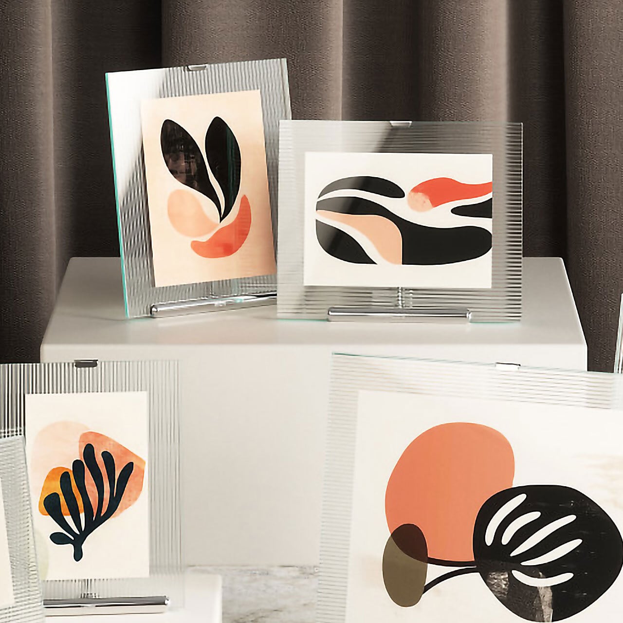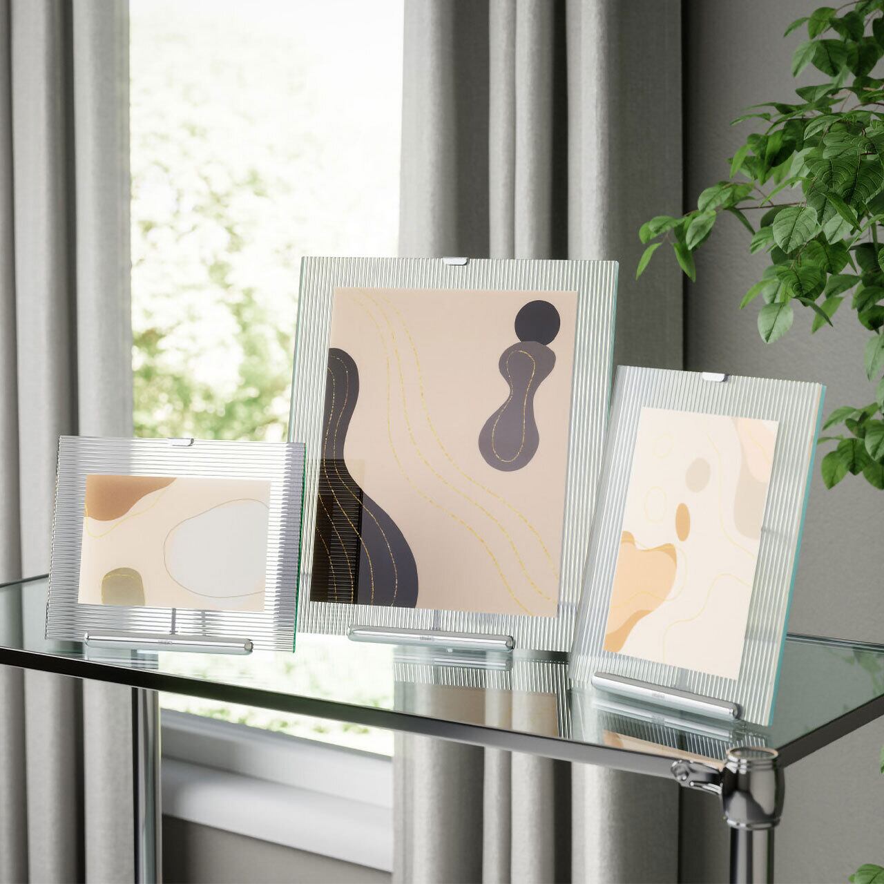 リブ付きガラス「フルートガラス」がエレガントな雰囲気の写真立て。イーゼルをモチーフにしており、ガラス面と金属の組み合わせがインテリアのアクセントになります。縦・横向きどちらでもディスプレイ可能。2枚のガラスパネルで写真をはさみ、大切な写真を傷やホコリから守ります。