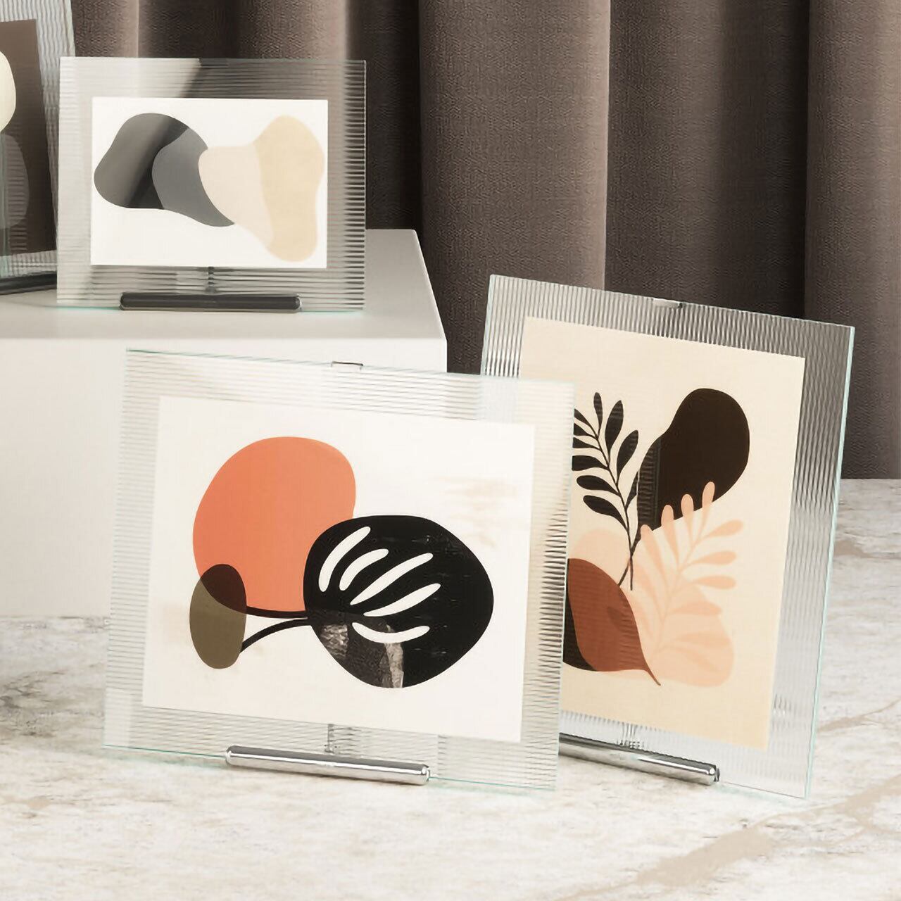 リブ付きガラス「フルートガラス」がエレガントな雰囲気の写真立て。イーゼルをモチーフにしており、ガラス面と金属の組み合わせがインテリアのアクセントになります。縦・横向きどちらでもディスプレイ可能。2枚のガラスパネルで写真をはさみ、大切な写真を傷やホコリから守ります。