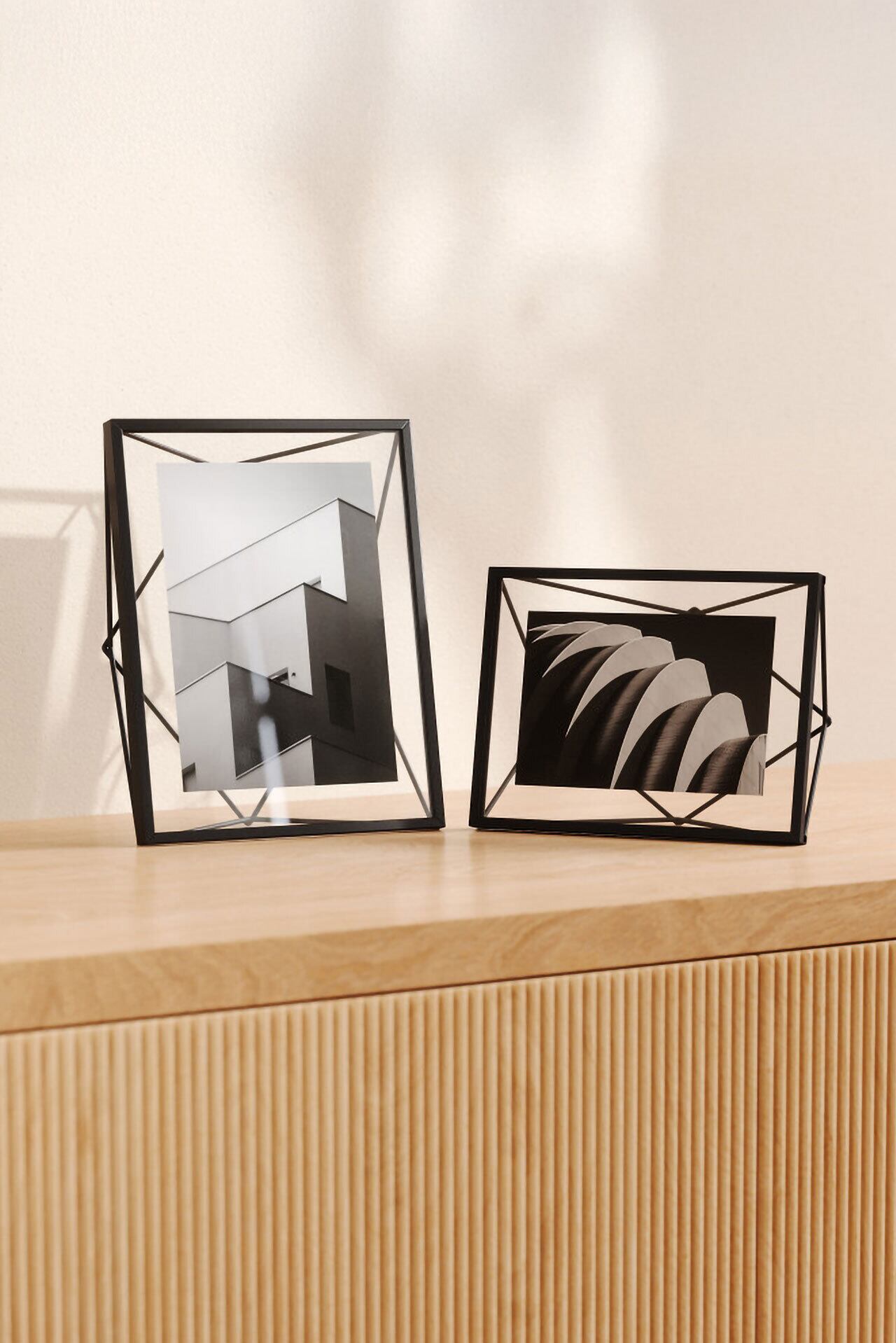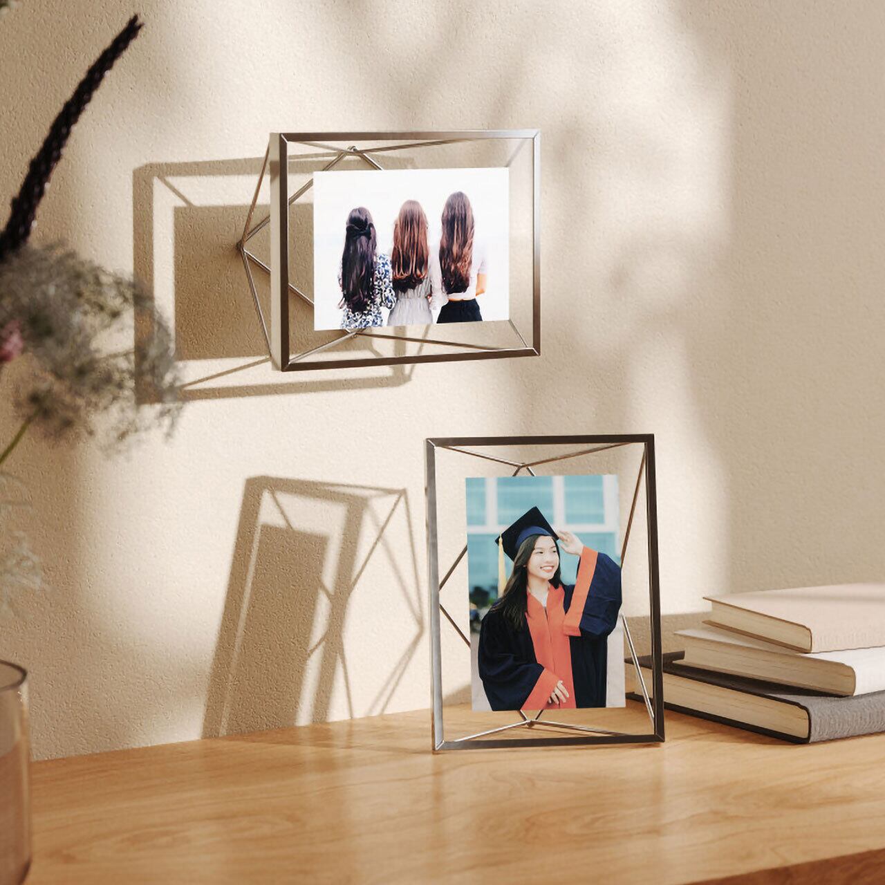 幾何学的な形状のワイヤーがまるで写真が浮いているように見え、インテリアにアクセントをもたらします。表面は大切な写真を守るガラス面。縦・横向きどちらでもディスプレイ可能。壁掛け・卓上どちらのフレームでもお使いいただけます。2枚のガラスパネルで写真をはさみ、大切な写真を傷やホコリから守ります。木ネジ、アンカービスが付属し、壁掛け・卓上、どちらにも飾ることができます。