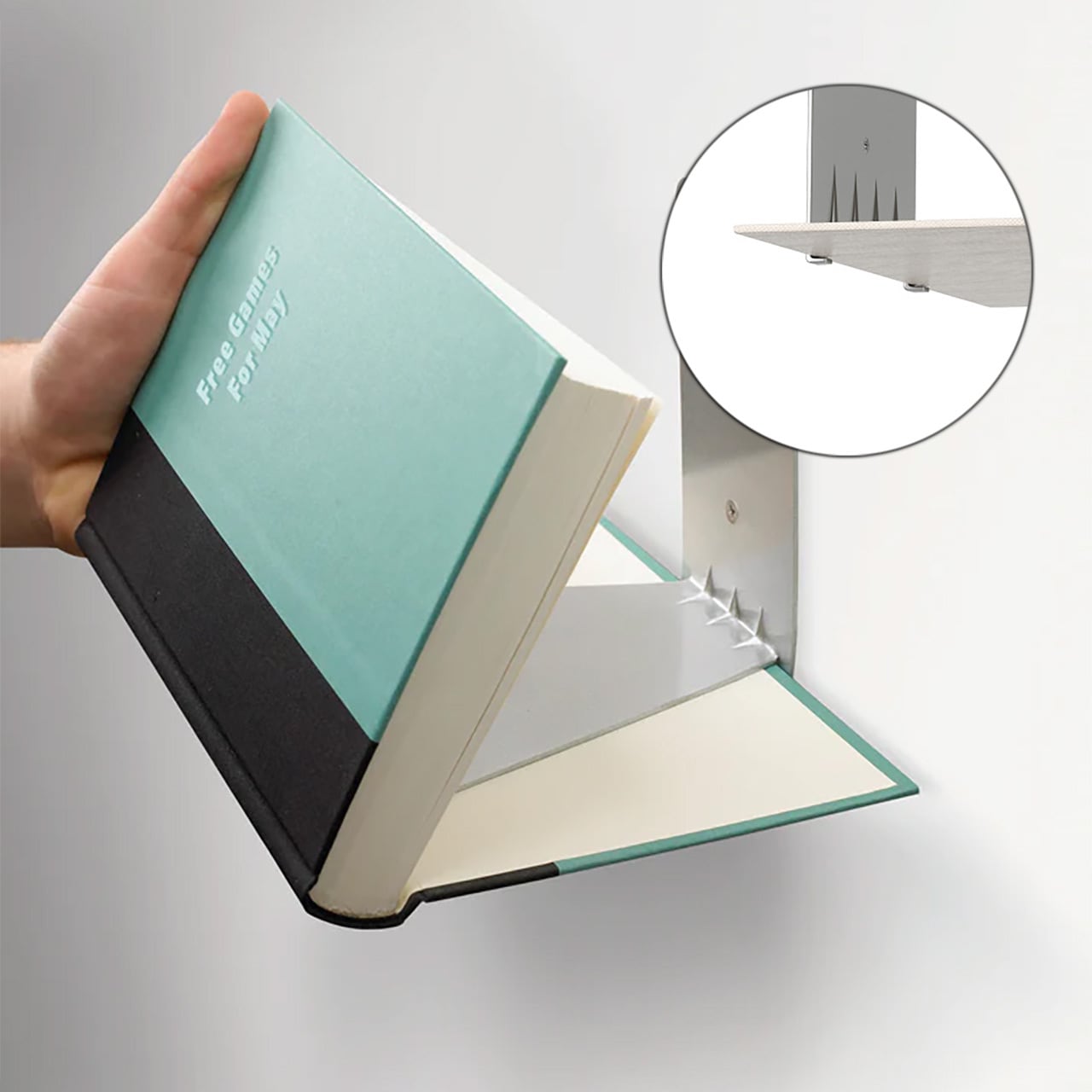 壁面側の爪に本をひっかけることで棚板部分を本で挟み込み、下から見上げた際に棚板が見えず、一定量積み上げれば壁面側の金具も隠れ、まるで本が浮いているように錯覚を覚えます。