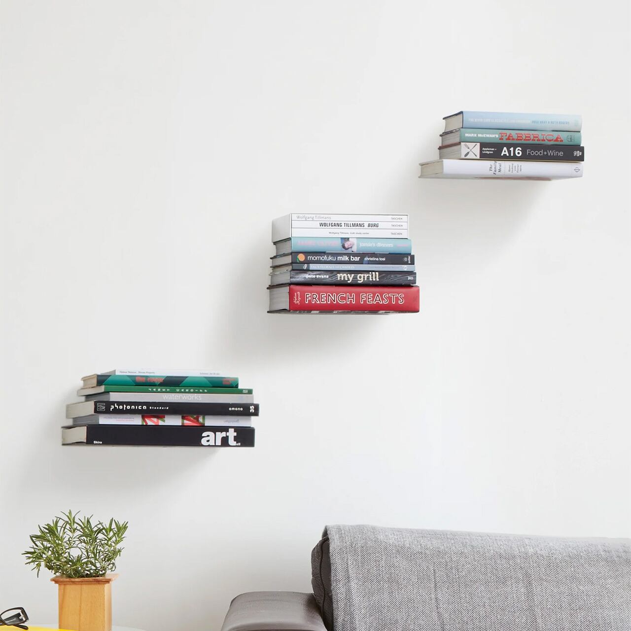 積み重ねた本がまるで浮いているように思わせるブックシェルフ。壁面側の爪に本をひっかけることで棚板部分を本で挟み込み、下から見上げた際に棚板が見えず、一定量積み上げれば壁面側の金具も隠れ、まるで本が浮いているように錯覚を覚えます。取り付けも容易で、3個組なので好きなようにレイアウトができます。堅牢なスチール製で、耐荷重は約9kgと安心の仕様。(強度のある壁面を前提としています)