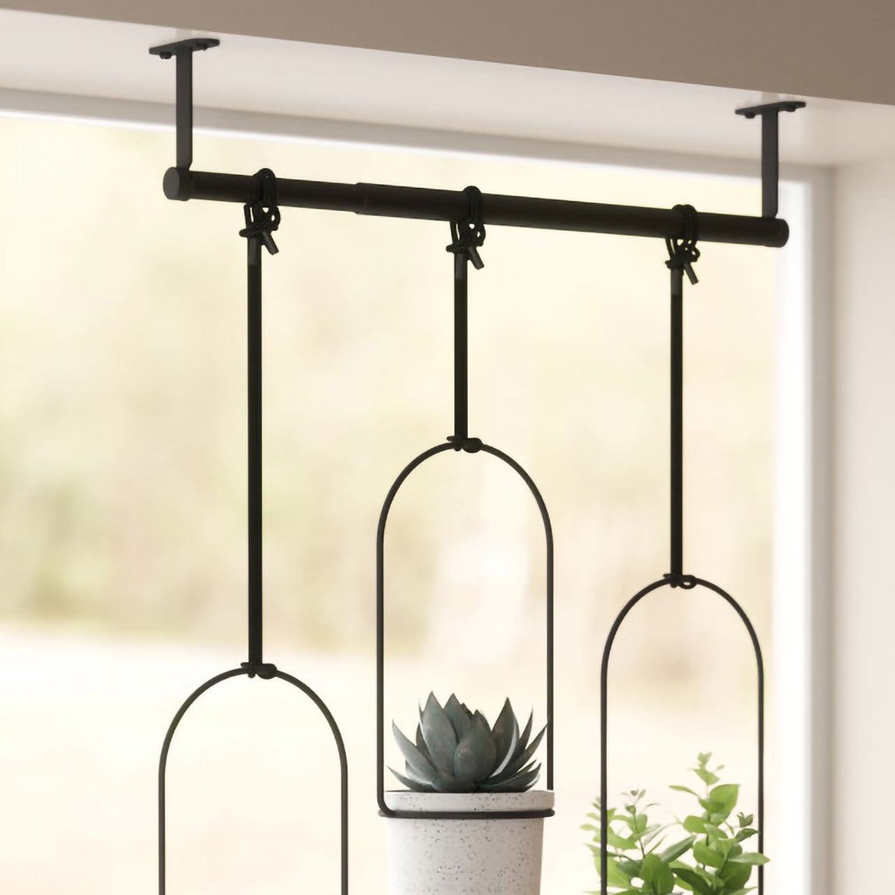 スチール製のレールに3つのプランターをロープで吊り下げて、コンパクトなスペースでも手軽に植物を飾ることができます。長さ調節可能なロープは、左右のレイアウトも自由に調節可能。プランターには直径7cmまでのポットをセットます。