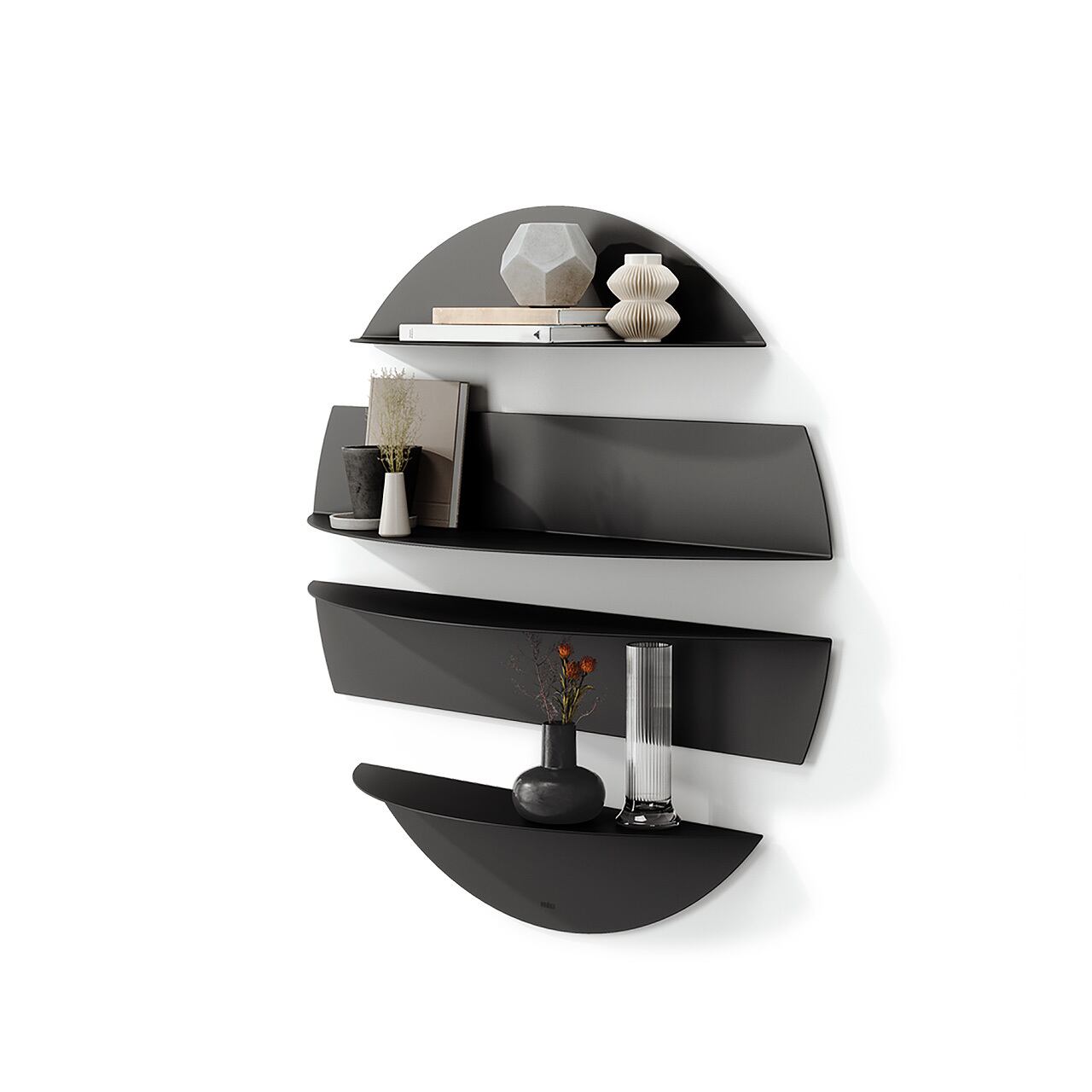 大きな棚2枚と小さな棚2枚で構成された、4枚セットのユニークなウォールシェルフ。個々に設置してもよし、イメージ画像のように円形に設置してユニークな壁面ディスプレイにすることも可能。耐久性のあるスチール製の丸みを帯びた棚になっており、観葉植物や、本、アクセサリー等を置いたり、普段よく使うアイテムを置いたりと、ディスプレーしながら実用性も兼ね備えています。耐荷重は小さい棚で4.5kgまで、大きな棚で6.8kgまでと強度も安心。(取り付け壁面の強度を確認ください。)