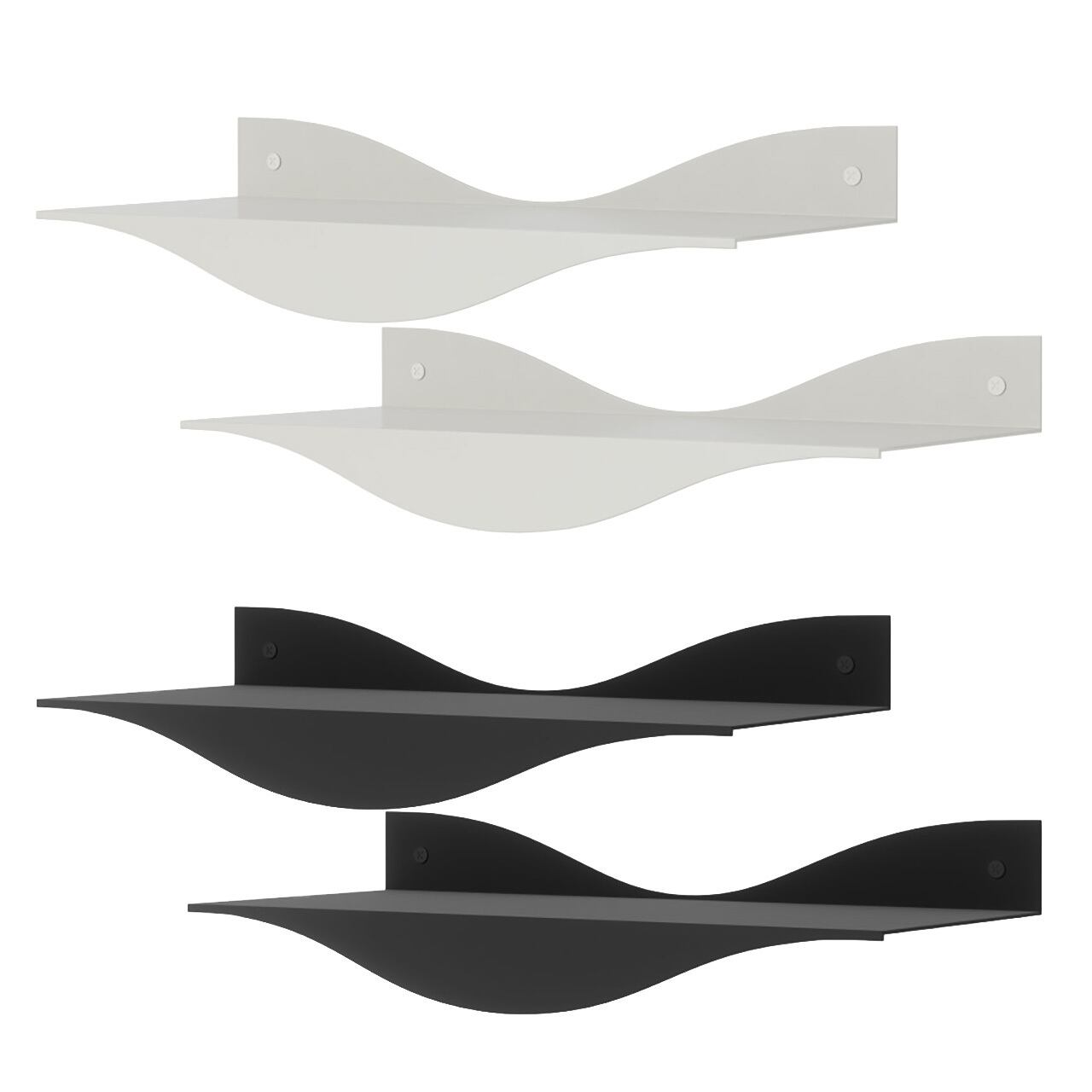 うねる波の上をサーフするような波模様を思わせるスタイリッシュなウォールシェルフ。2個組で連結して使用でき、さらに追加して使用すると印象的なディスプレーも可能です。上下を逆にして取り付けも可能なのでイメージに変化をつけることもできます。手前には返しがついているので、取り付け方向によって落下防止にもなります。高品位なマット質感のスチール製で一棚あたりの耐荷重は約6.8kgと堅牢。シックでモノトーンのカラーリングで多様なインテリアにマッチします。