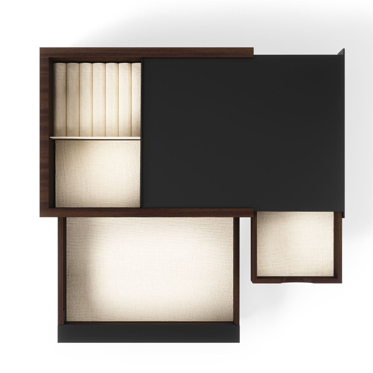 ■大小の引き出しと、上段の蓋をずらすと、隠し収納スペースがあらわれます。引き出しの内側には、リネンの布パッドが貼ってあり、アクセサリーを傷から守ります。