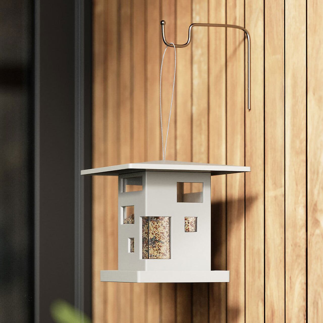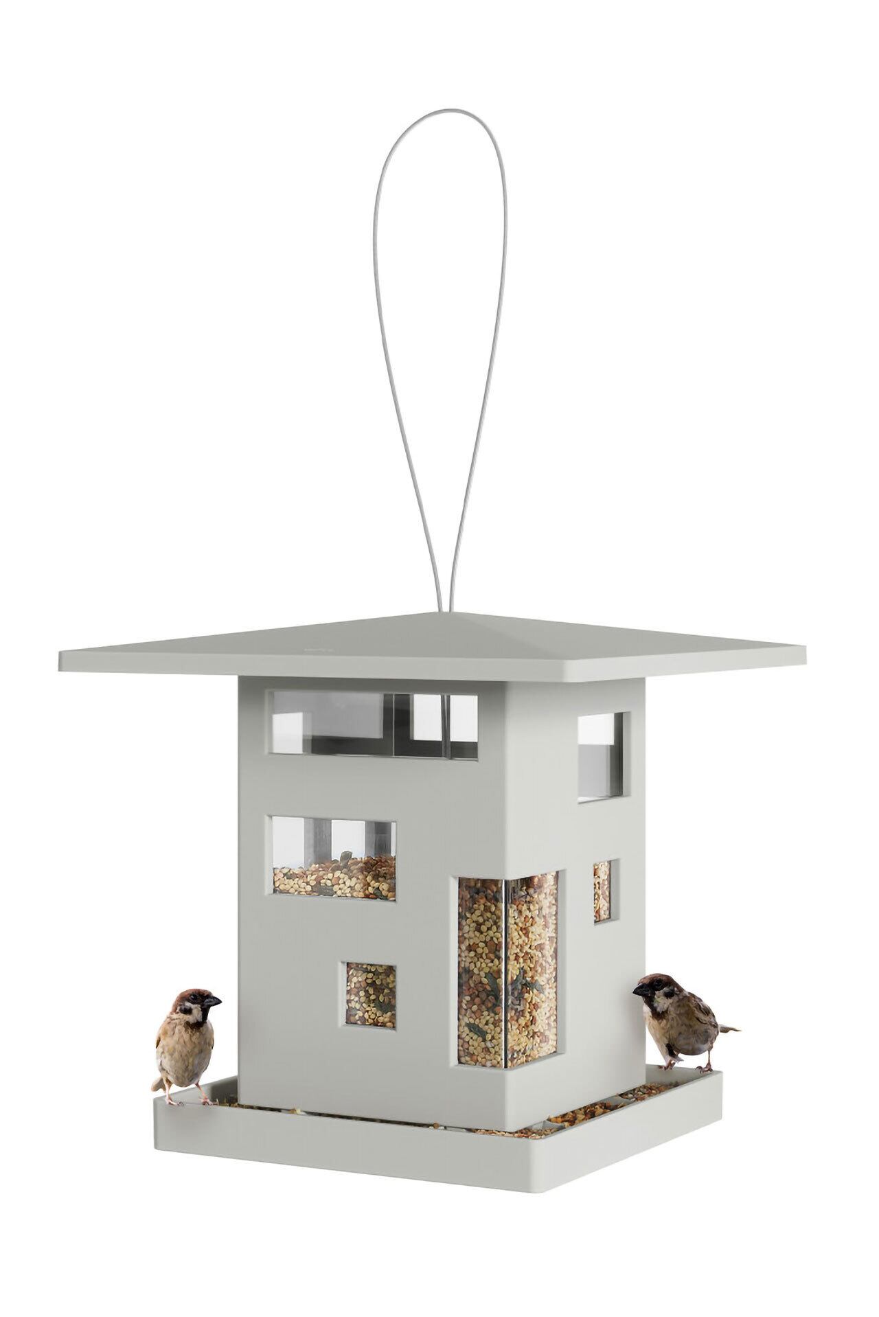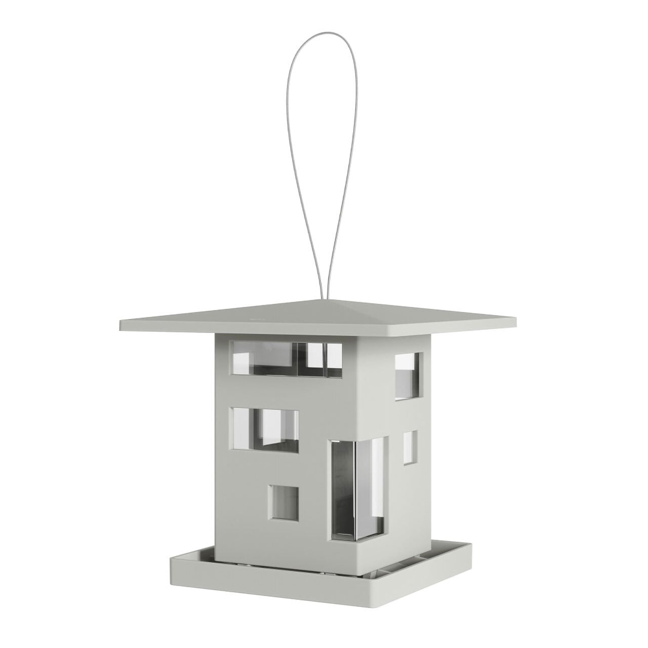 遊び心あふれるデザインと機能性を兼ね備えたバードフィーダー(鳥用餌台)。足場があるので、鳥や小動物が餌を食べやすい設計。屋根は張り出しのデザインになっているので雨しずくも下に落としやすく渇きも早いのが特徴です。半透明の窓から、エサの減り具合もひと目で確認できます。