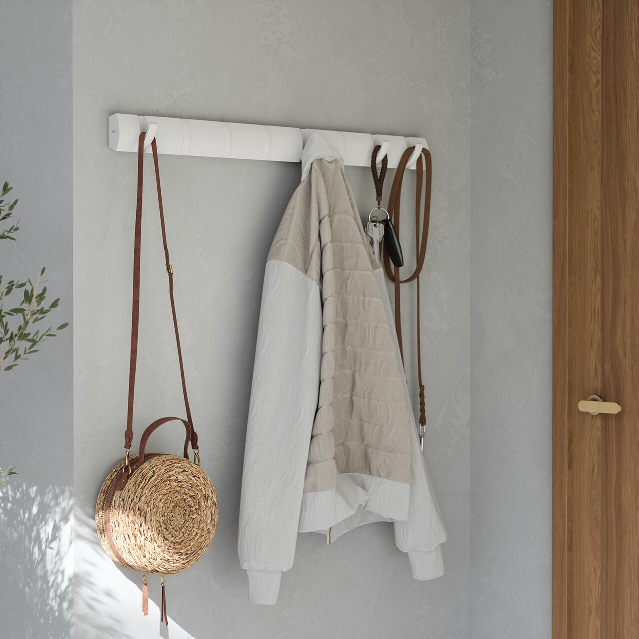 バッグやコートなどを簡単に引っ掛けて収納できるフリップフック8連。金具部分を手前に倒すとフックになります。使用しない時はフックを収納できるので、すっきりと見せることができます。