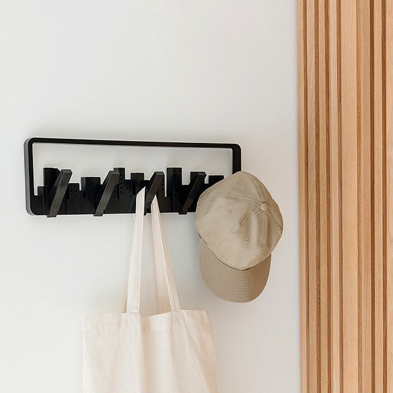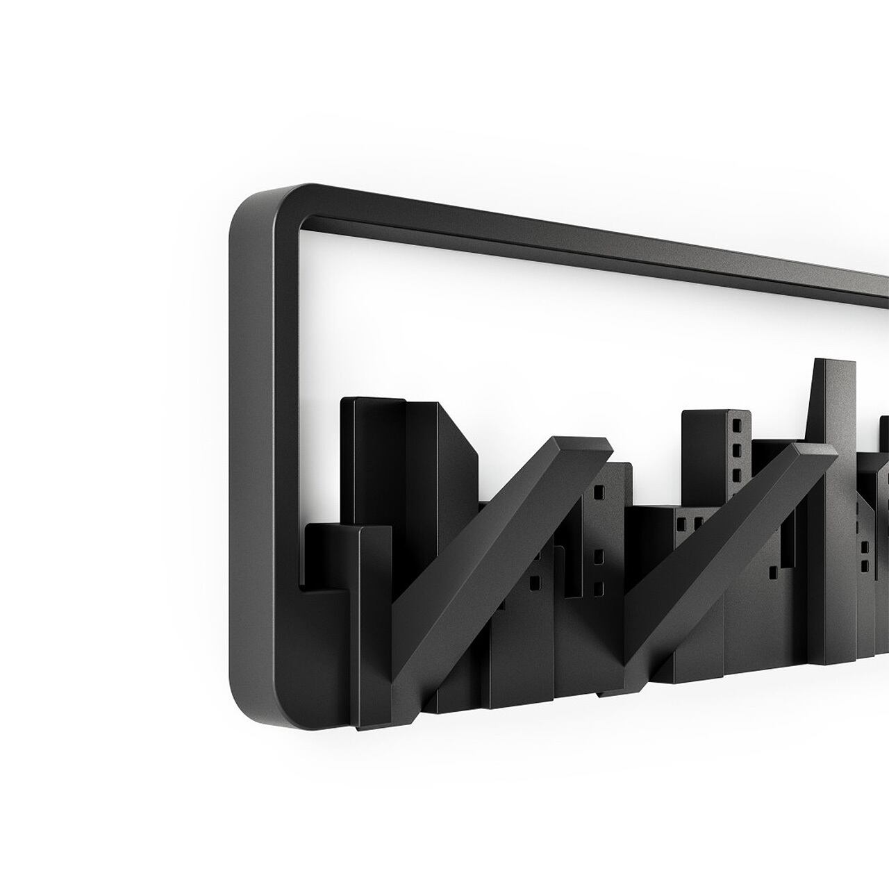 機能性とデザイン性が両立した、5つのフリップダウンフックを備えた壁掛けフック。都会の街並みの様な幾何学的なモチーフと、壁を窓があるかのように見せるデザインが特長です。5つの折りたたみ式のフックにはスカーフ、アクセサリー、バッグ、コートなどを吊るせ、それぞれ最大2.3kgの荷物を掛けることができます。使用していないときにはアートピースのように壁のアクセントになります。環境にも配慮したリサイクルプラスチックを使用しています。