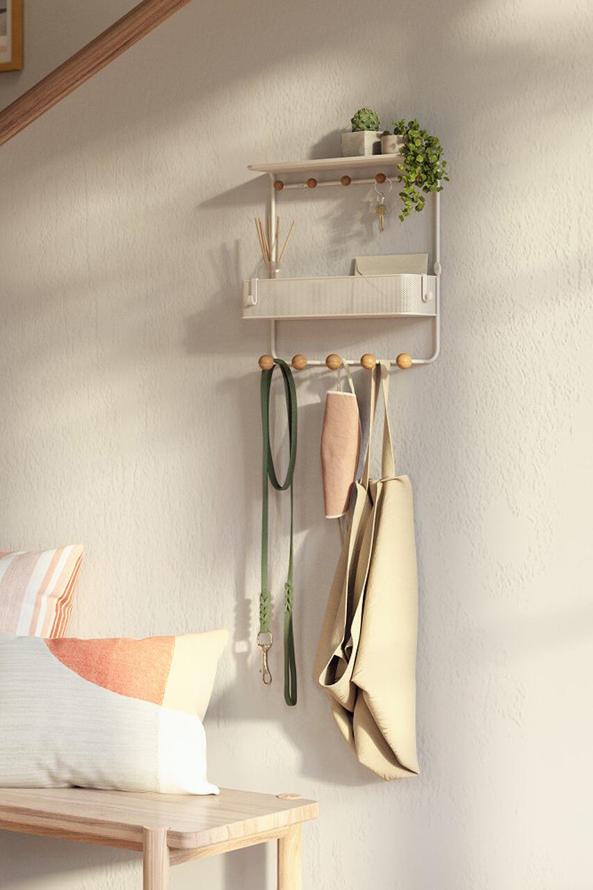 トップトレイが組み込まれたパンチング金属バスケットと、鍵、メール、ジャケット、バッグ、その他の日常の必需品を収納するための10個のフックを備えたエントランスなどに最適な収納アイテムです。外出時や帰宅時に習慣的な整理整頓が可能。ミニマルでシンプルなモダンデザインながら、フック先端に天然木を用いることでアクセントを付けて柔らかな印象も付け加えています。耐荷重も総重量18kgと収納力、耐久性も抜群。