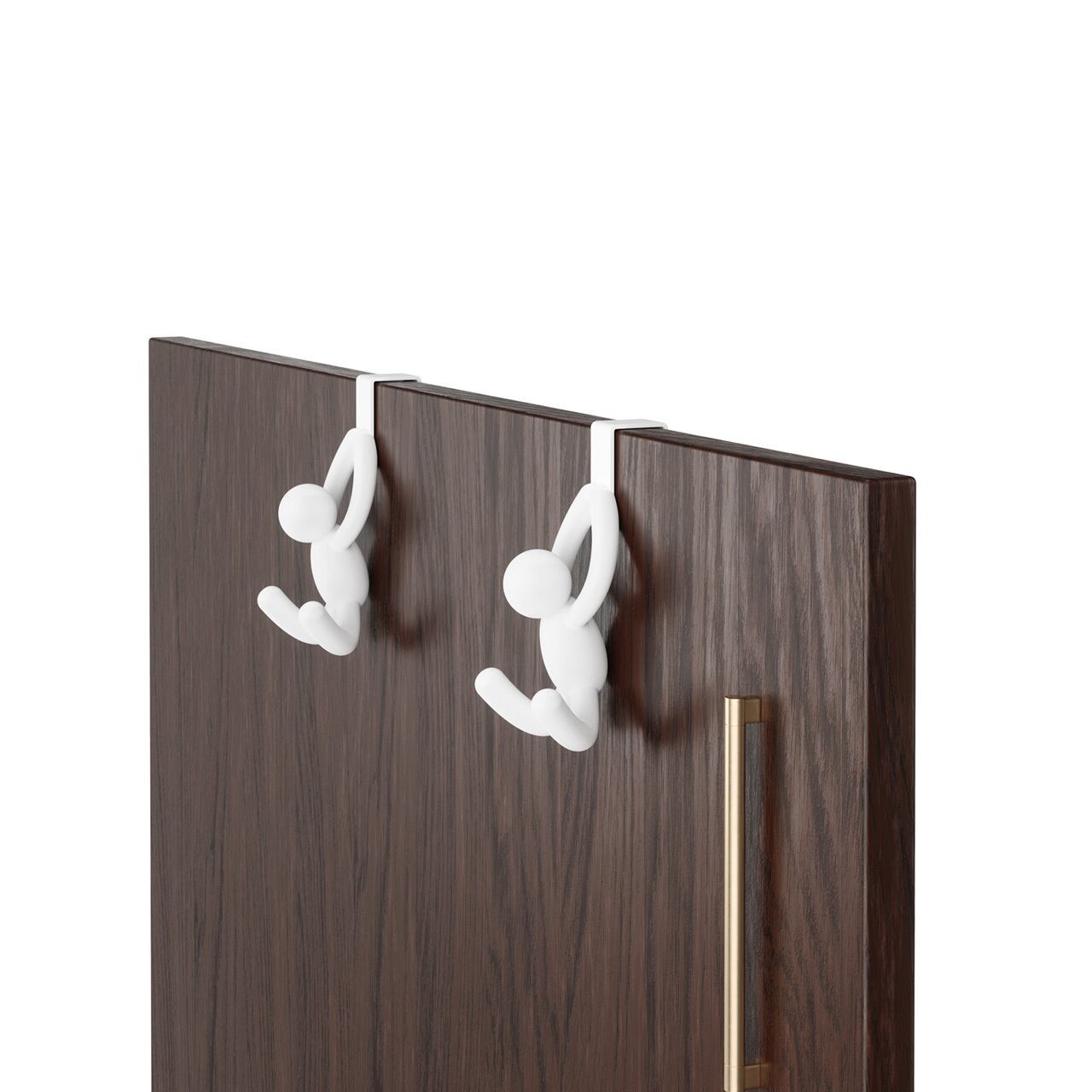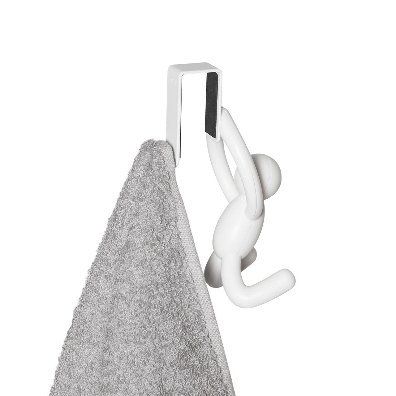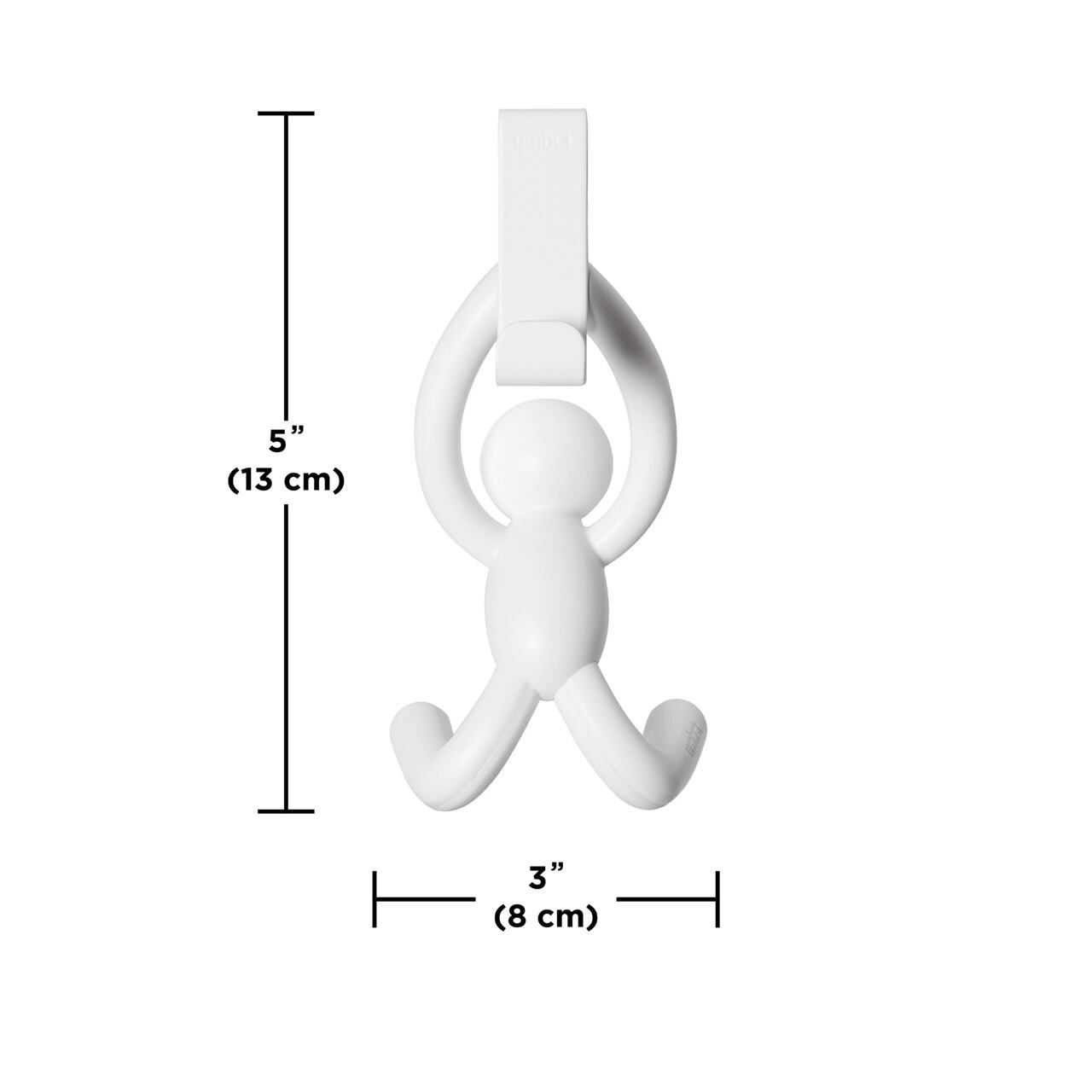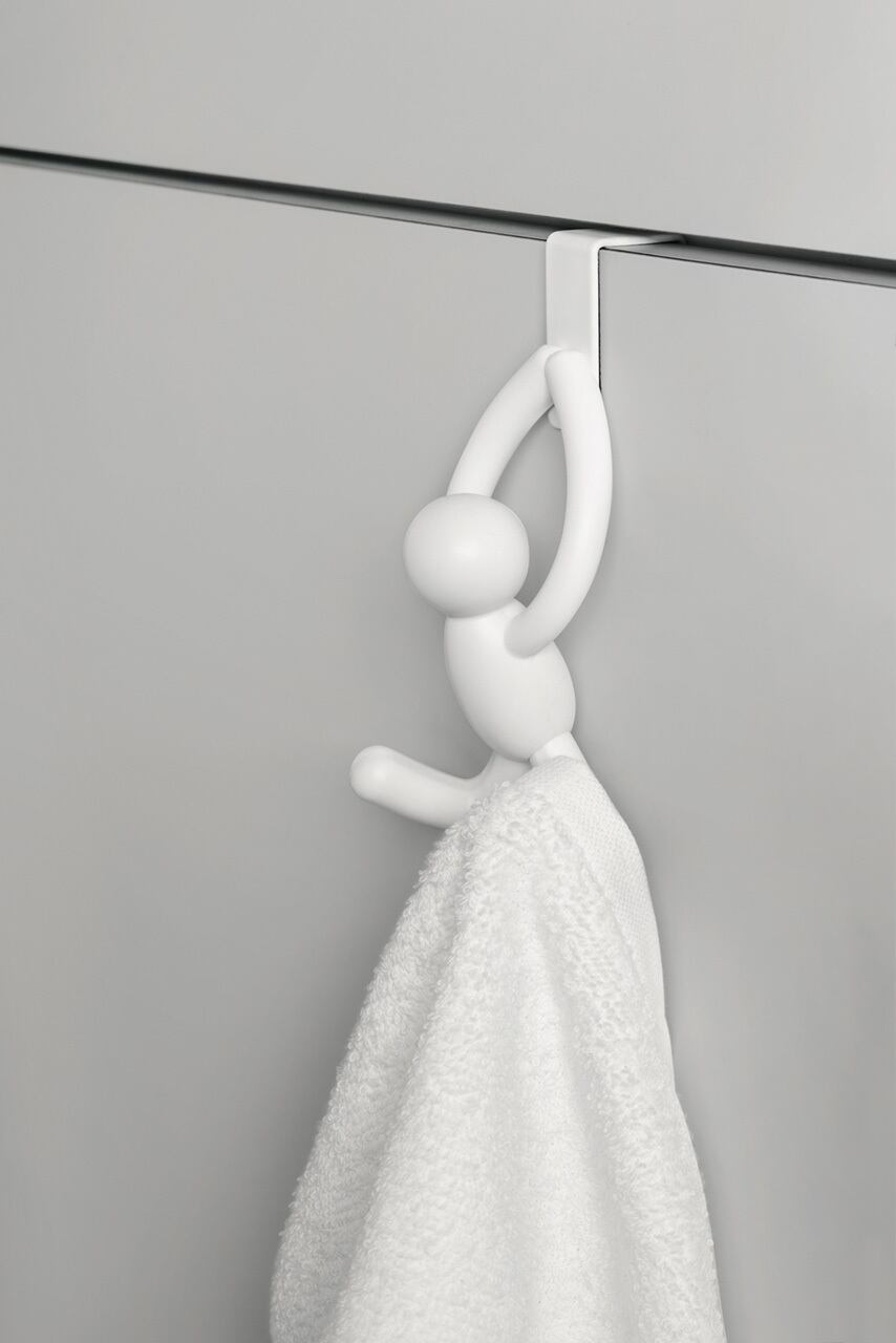 Umbraオリジナルキャラクター「バディ」のフック。タオルや袋などよく使うものを掛けておくのに便利です。扉に乗せるだけの簡単設置で気軽に場所の変更も可能。先端には滑りにくくするためのゴムがついており、扉への傷つけ防止の為に裏地が付けてあります。また、扉の表側だけでなく、内側にもフックがついており、両面にフックがついている仕様。2個組なので揃えて設置するも良し、各々で使うも良し。