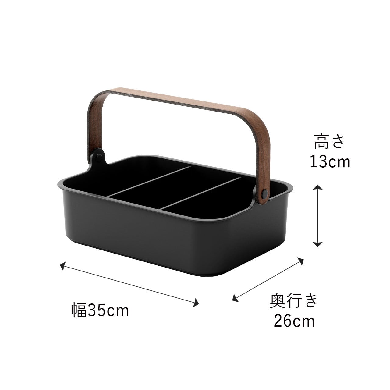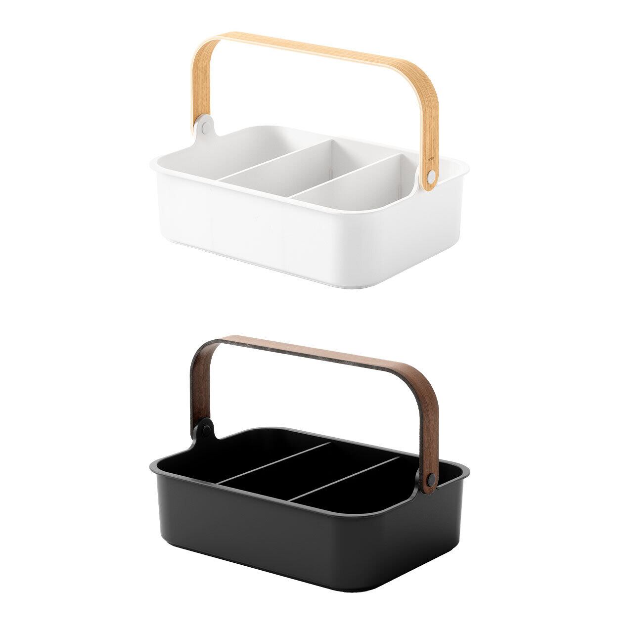 ■取り外し可能な仕切りと、持ち運びに便利な木製ハンドル付き。ハンドルを倒せばスタッキング可能。
