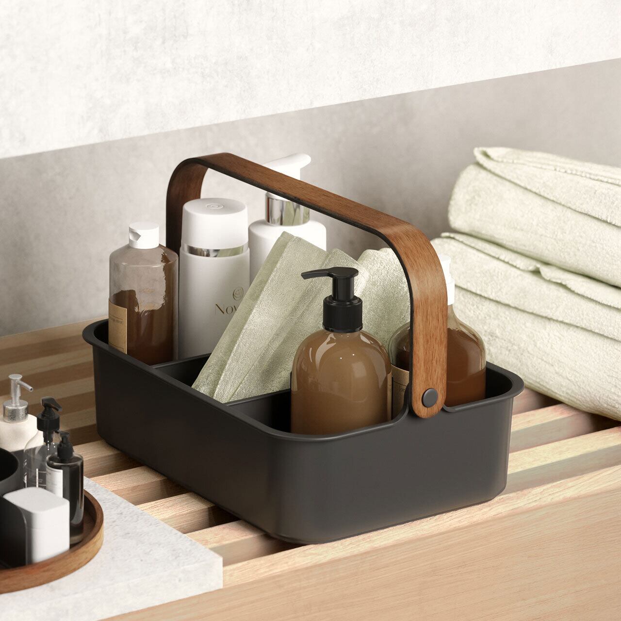 便利な仕切りとハンドル付きの収納ボックス。調味料、バスアイテム、コスメ、文房具など細々したものの収納にぴったりサイズ。リサイクルプラスチックと再生可能な木材で作られています。