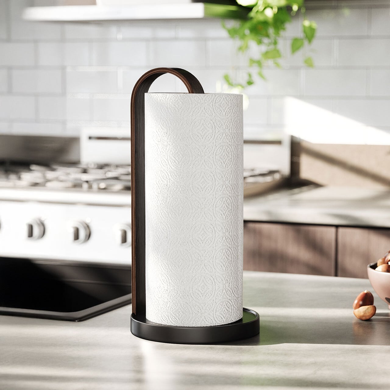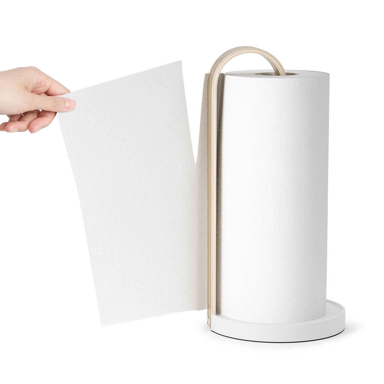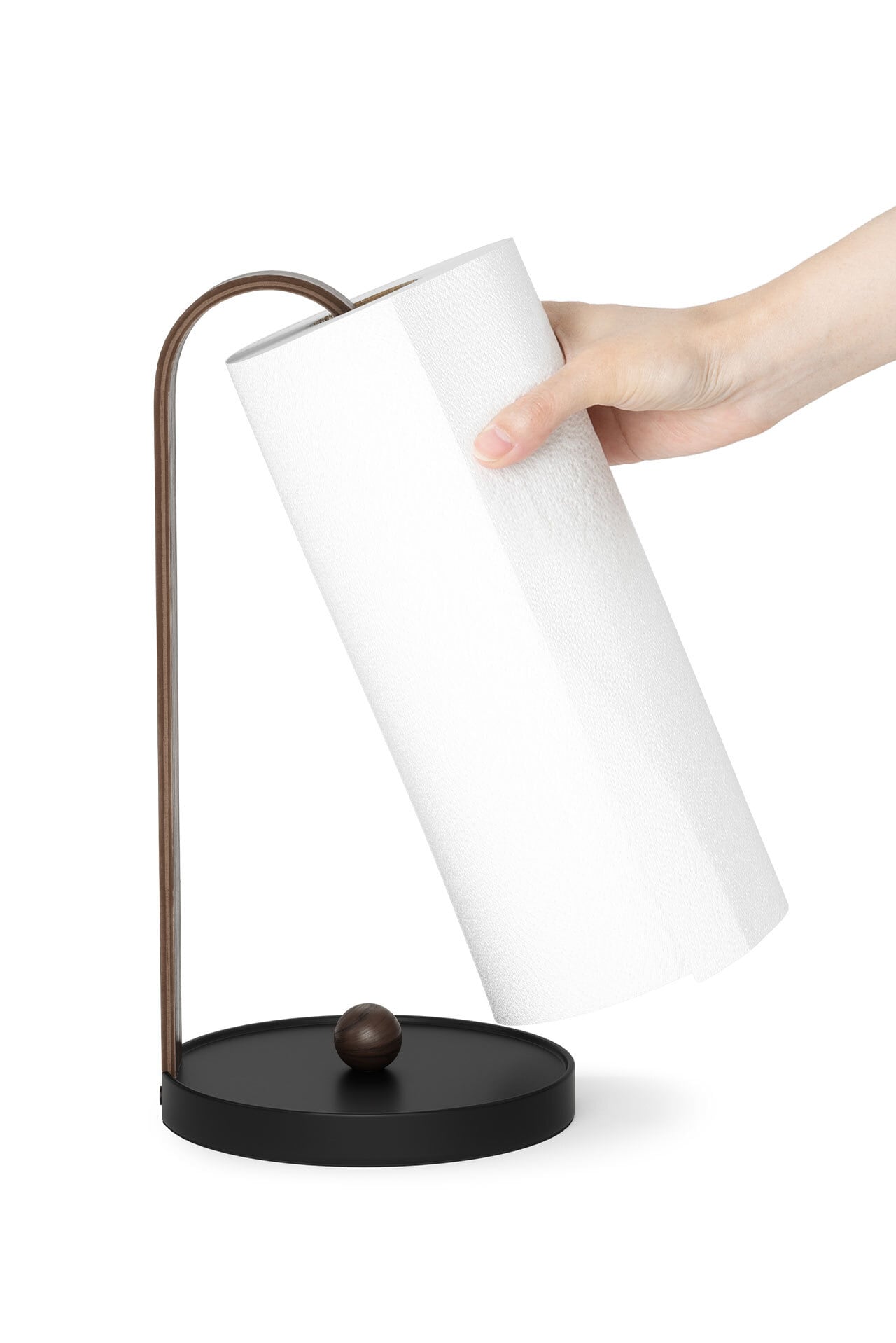 再生可能な木材を使用した、ペーパータオルホルダー。美しい曲木デザインを取り入れて、空間をスタイリッシュに彩ります。金属製の台座は安定感があり、片手で簡単にペーパーを引き出すことができます。