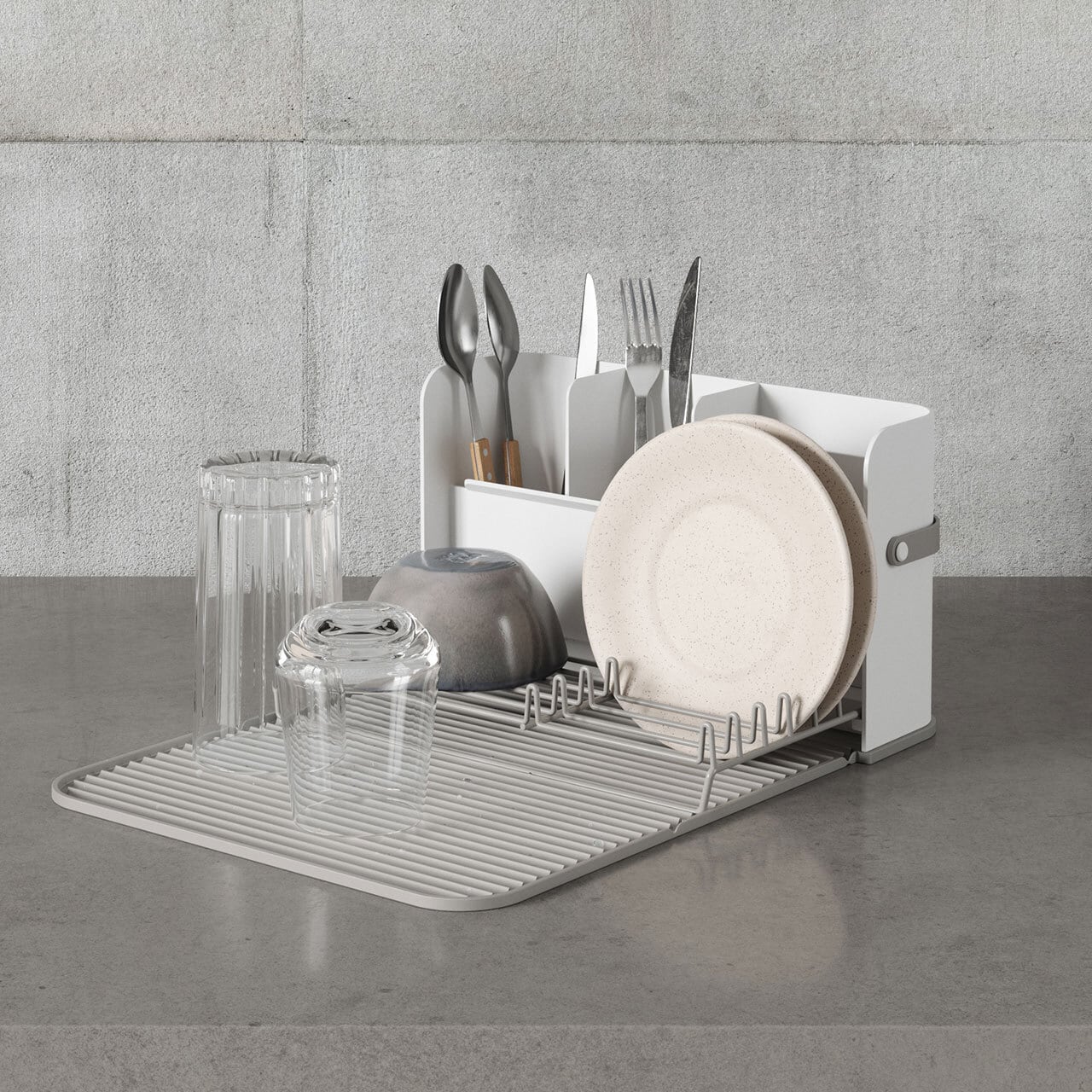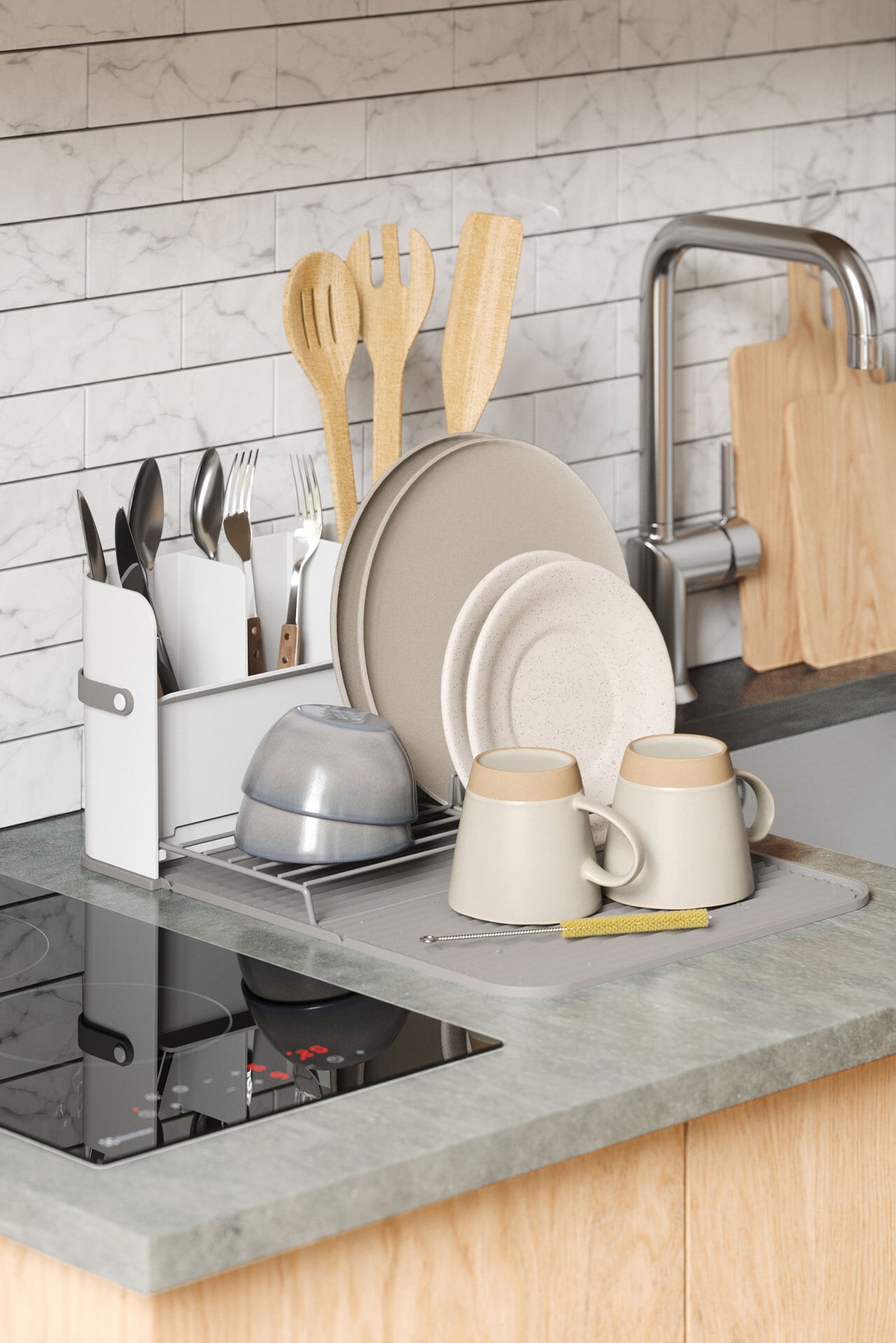 ■マット、カトラリー立て、ディッシュラックがセットになった水切りラック。マットには溝があり通気性が良く乾きやすい設計。マットは取り外し可能で食洗機にも対応しています。