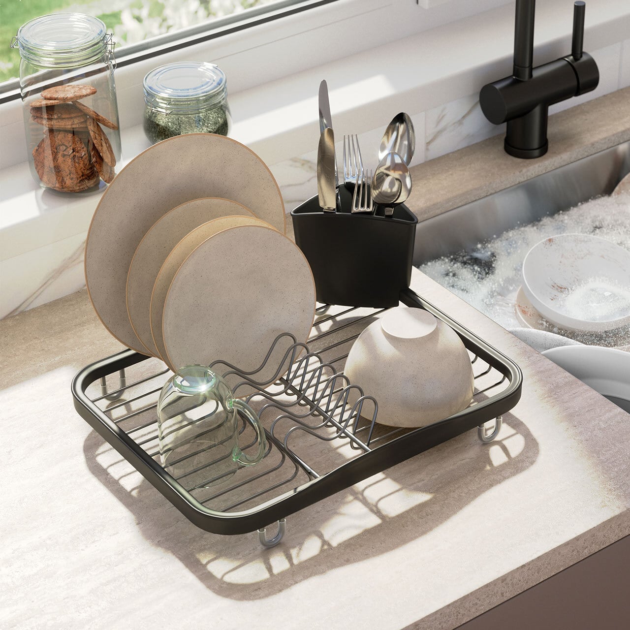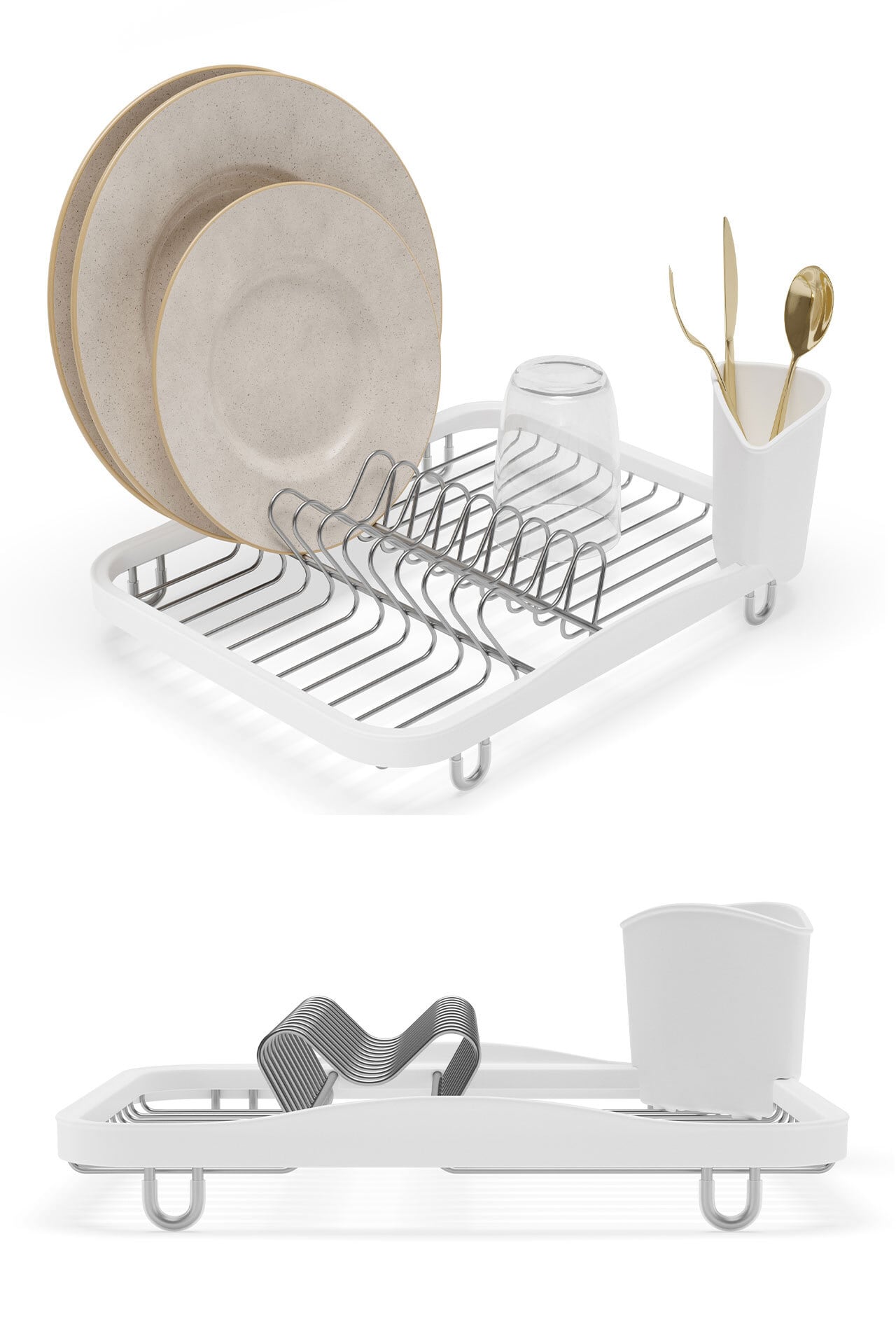 シンクの中でも外でも使えるシンプルなディッシュラック。カトラリー入れは取外し可能。脚部分はラバー加工されており、シンクはキッチンカウンターが傷つきにくくなっています。
